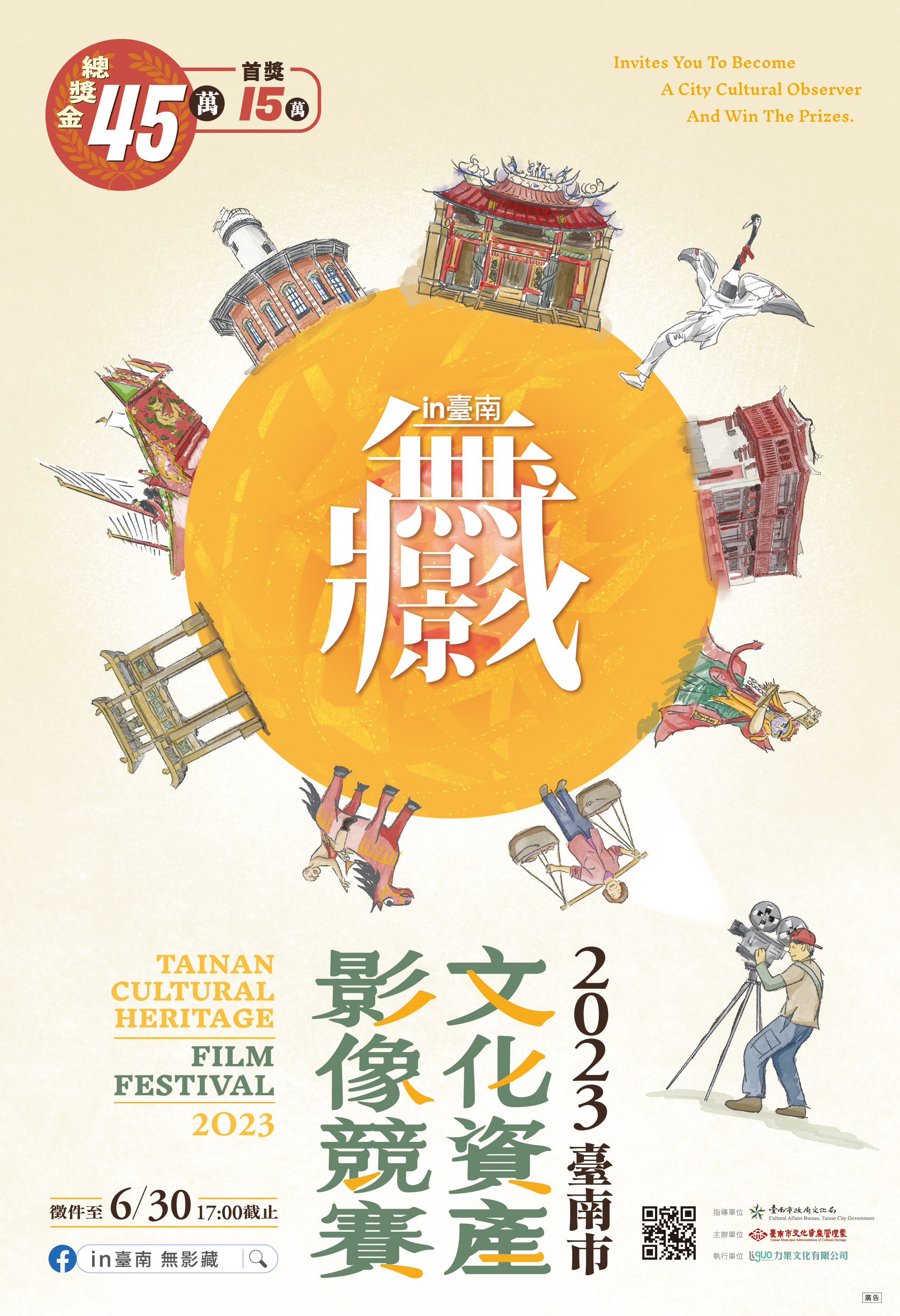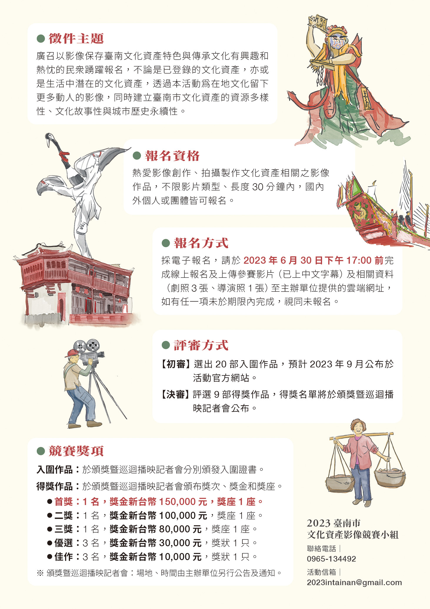 二、徵件期自即日起至 112 年 6 月 30 日 17:00 止,以臺南市已登錄 或生活中潛在的文化資產為創作元素與發想,不限影片類 型、長度 30 分鐘以內,個人或團體國內外人士皆可報名。 總獎金 45 萬元。詳情請上官網查詢 (https://2023intainan.com/)。