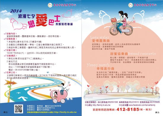 一、本年度浪漫七夕活動規畫辦理 1 日聯誼活動,內容如下: