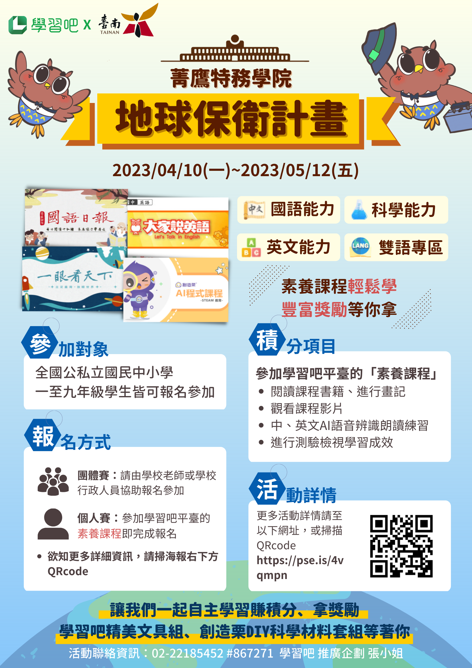 說明: 一.依據學習吧教育平臺字第 11203005 號函。 二.活動簡介: (一).為鼓勵學生自主學習,培養世界觀及國際視野,學習吧平臺整合素養課程中的優質數位內容辦理線上學習活動,並採取遊戲化的積分機制, 以增進學生語文理解、口語表達及媒體識讀能力。 (二).活動課程搭配 AI 語音辨識技術自動判定朗讀結果 ,能有效增進學生口語表達能力;測驗系統自動批改,學生可重複練習。透過學習吧平臺 之即時回饋功能,以啟發學生對各科學習動機,培養自主學習的習慣。 三.活動相關資訊: (一)活動時間: 112 年 4 月 10 日至 5 月 12 日。(活動期間可隨時報名參加)。 (二)參加對象:全國公私立國民中小學 ,一到九年級學生皆可報名參加。 (三)活動方式:線上積分活動。(請詳閱附件海報)。 (四)檢附旨揭活動海報 1 份。請協助列印張貼海報或公告周知。 (五)活動詳情請先自行至以下網址參閱: https://www.learnmode.net/activity_i/6/intro#section2 或掃描附件海報上的 QRcode 。 (六)若有相關問題,可洽承辦人員學習吧推廣企劃張小姐 ,聯絡電話: 02-22185452 分機 867271 。 |
