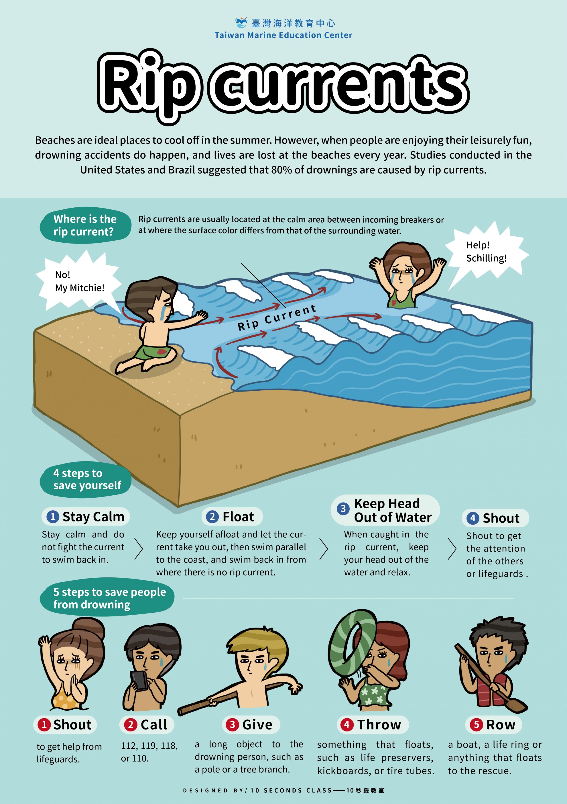 離岸流-夏季海岸沙灘風景非常美麗,是戲水消暑的好場所,但每年總有溺水的不幸事件發生,奪走無數寶貴的生命。根據巴西與美國的研究資料顯示,近八成海灘溺水事件,都是離岸流造成。
