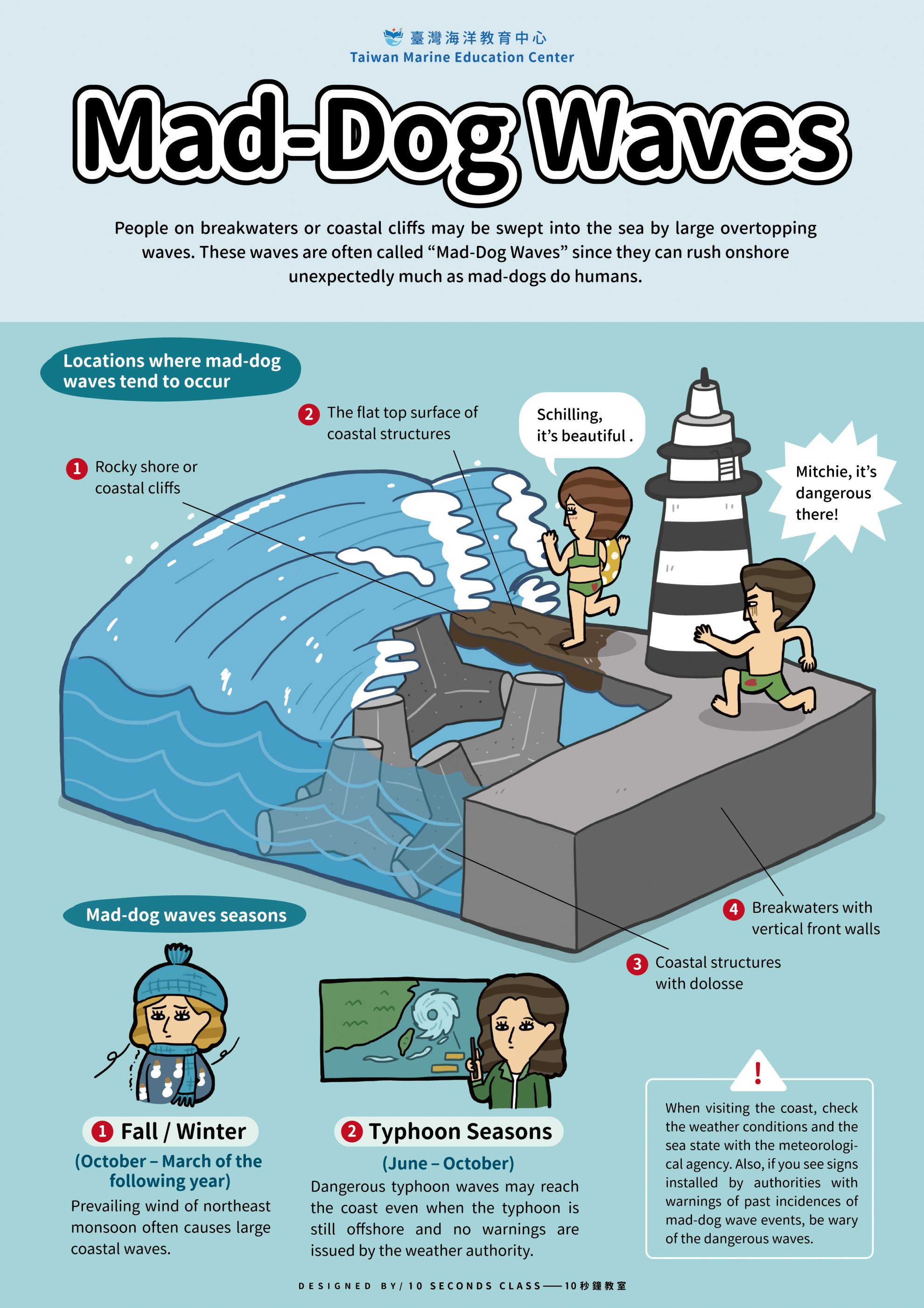 2.颱風季節(6 月至 10 月)當海面上有颱風,就算為發布颱風警報,仍可能受長浪影響發生瘋狗浪。 政府相關單位都設有警告或禁止標誌,民眾前往時,不僅要有安全防護的裝備,而且也要注意氣象及海象的變化,隨時小心防範,以免造成意外而後悔莫及。