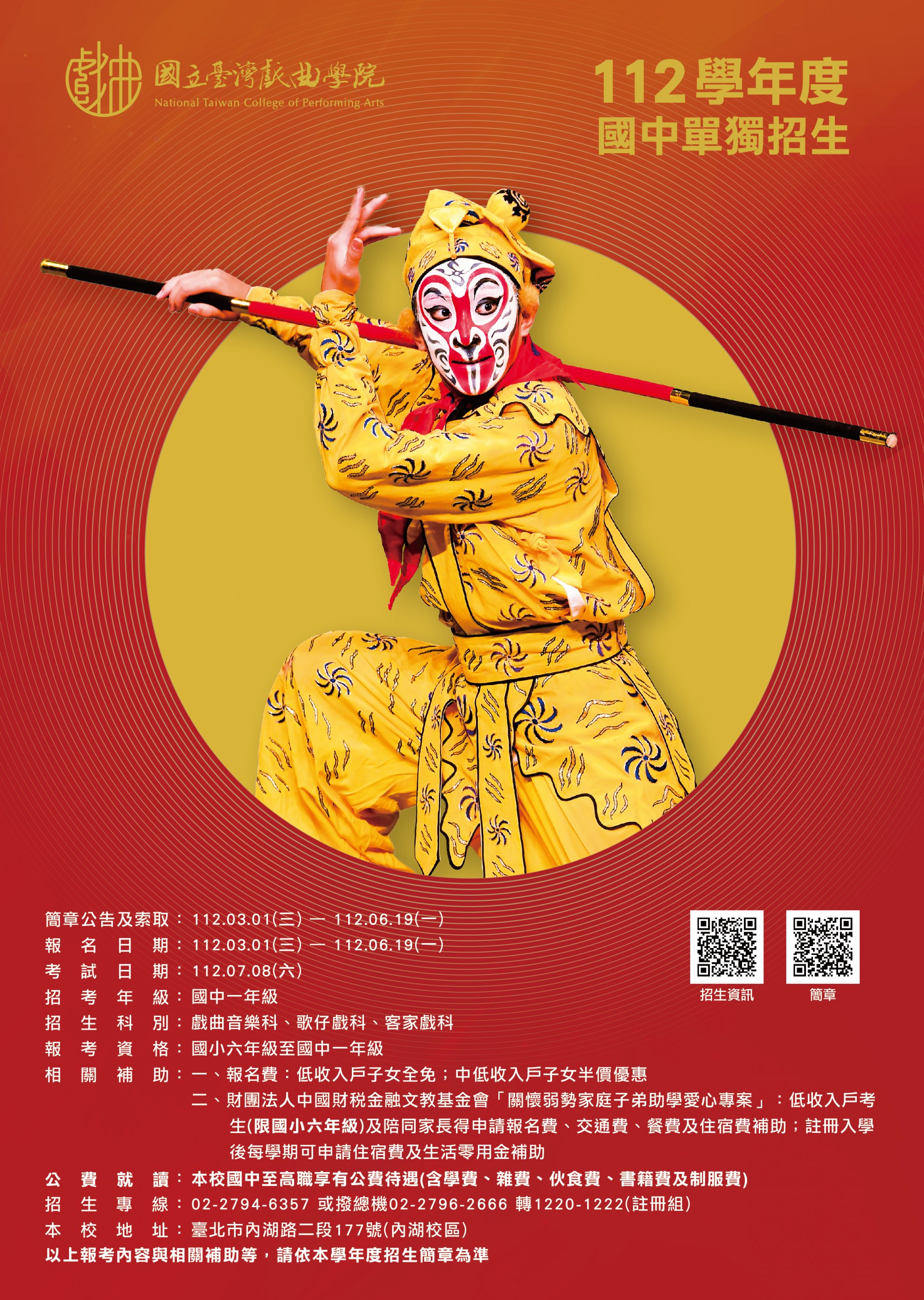 國立臺灣戲曲學院 112 學年度國小與國中部單獨招生暨轉學單獨招生及高職部轉學單獨招生訊息