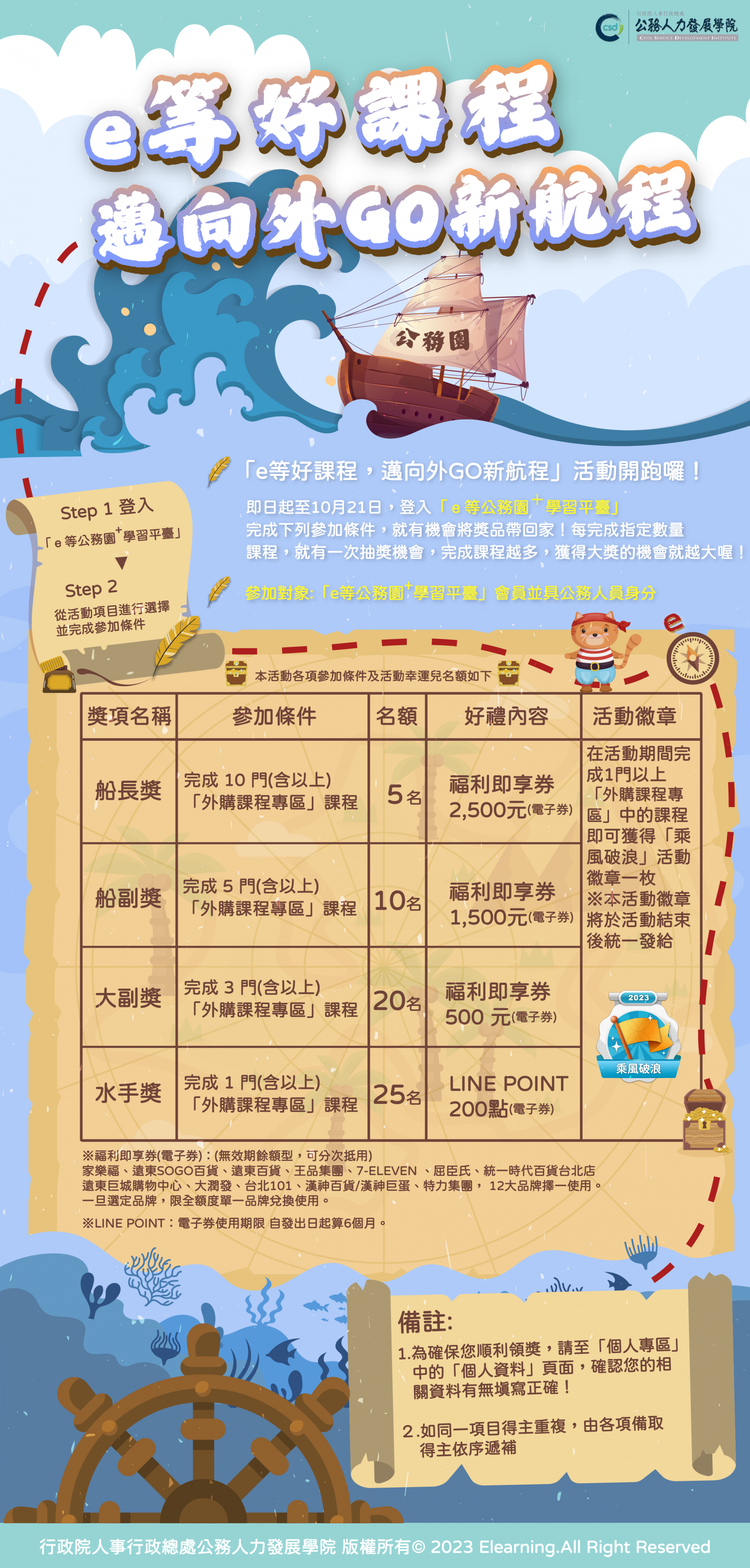 二、人力學院特辦理「 e 等好課程,邁向外 GO 新航程 」線上抽獎活動,凡於本( 112 )年 10 月 21 日前至「e 等公務園+學習平臺」選讀完成任 1 門「外購課程專區」課程,即可參加抽獎(活動內容詳如附件 2 )。