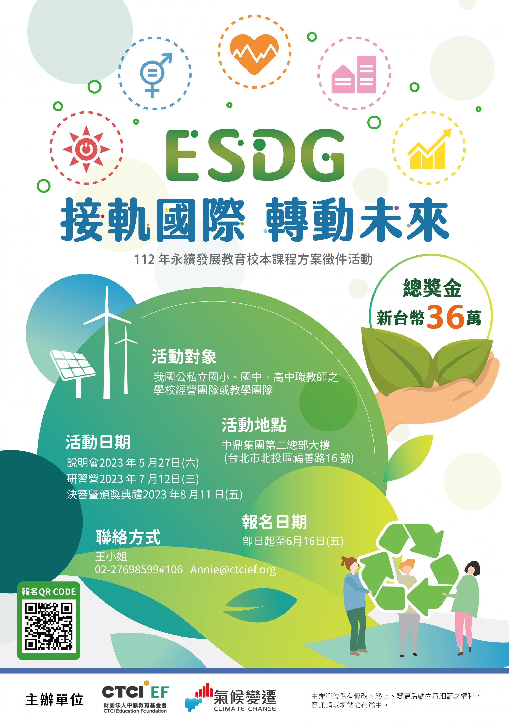 一、強化我國教育人員對於永續發展教育(ESD)與聯合國永續發展目標(SDGs)的認識,並了解國際上正在發生的新趨勢: ESD+SDG=ESDG ,以此思維與框架設計校本位課程,接軌國際趨勢,發揮學校特色,並將 SDGs 融入校本課程,呼應全球與在地關鍵永續發展議題,提昇全校師生之永續發展素養。中鼎教育基金會(CTCI EF)與教育部氣候變遷教育計畫共同籌辦「ESDG 接軌國際、轉動未來-112 年永續發展教育校本課程方案徵件活動」。