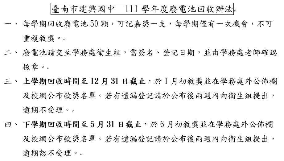 依據臺南市建興國中 111 學年度廢電池回收辦法,每學期回收廢電池 50 顆,可記嘉獎一支。