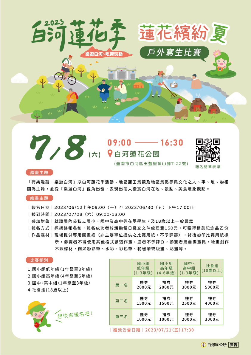 一、本區辦理蓮花季活動迄今(112)年已有 28 年,每年暑假期間 皆吸引國內外遊客前來賞花,本所今年推出優質蓮花寫生 藝文活動,希冀全國學齡以上大小朋友及一般民眾踴躍報 名參賽,同時前來白河旅遊,共襄臺南夏季賞花盛事。