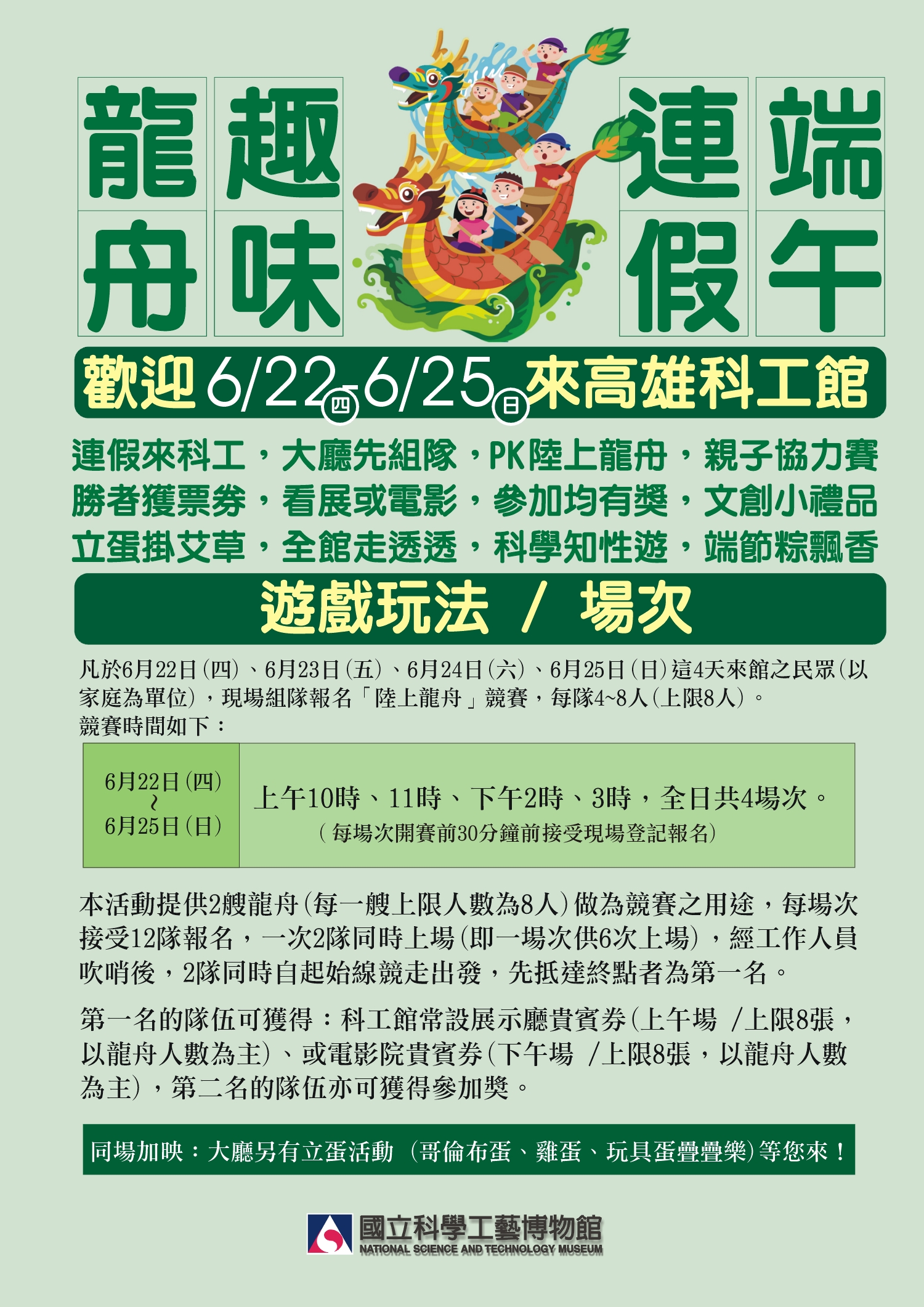 二、活動說明: (一)時間:本年 6 月 22 日(週四)至 6 月 25 日(週五)端午連 續假期科工館開館期間。 (二)對象:所有尚未購票入館的家庭均可參加。 (三)地點:科工館北館 1F 大廳。 (四)競賽時間: 1、 6 月 22 日(週四)上午 10 時、 11 時、下午 2 時、 3 時,全日 共 4 場次。 2、 6 月 23 日(週五)上午 10 時、 11 時、下午 2 時、 3 時,全日共 4 場次。 3、 6 月 24 日(週六)上午 10 時、 11 時、下午 2 時、 3 時,全日 共 4 場次。 4、 6 月 25 日(週日)上午 10 時、 11 時、下午 2 時、 3 時,全日 共 4 場次。 (五)遊戲規則:以家庭成員為主,於現場報名組隊參與,組 隊人數 4~8 人(上限為每隊 8 人),每場次開賽前 30 分鐘接 受現場登記報名。本館提供 2 艘龍舟(每艘上限人數為 8 人)做為競賽之用途,每場次接受 12 隊報名,一次 2 隊同 時上場(即一場次供 6 次上場),經工作人員吹哨後, 2 隊 同時自起始線競走出發,先抵達終點者為第一名,第一 名的隊伍可獲得:科工館常設展示廳貴賓券(上午場贈 品,上限 8 張,以龍舟人數為主)、科工館電影院貴賓券 (下午場贈品,上限 8 張,以龍舟人數為主),第二名的隊 伍亦可獲得參加獎。