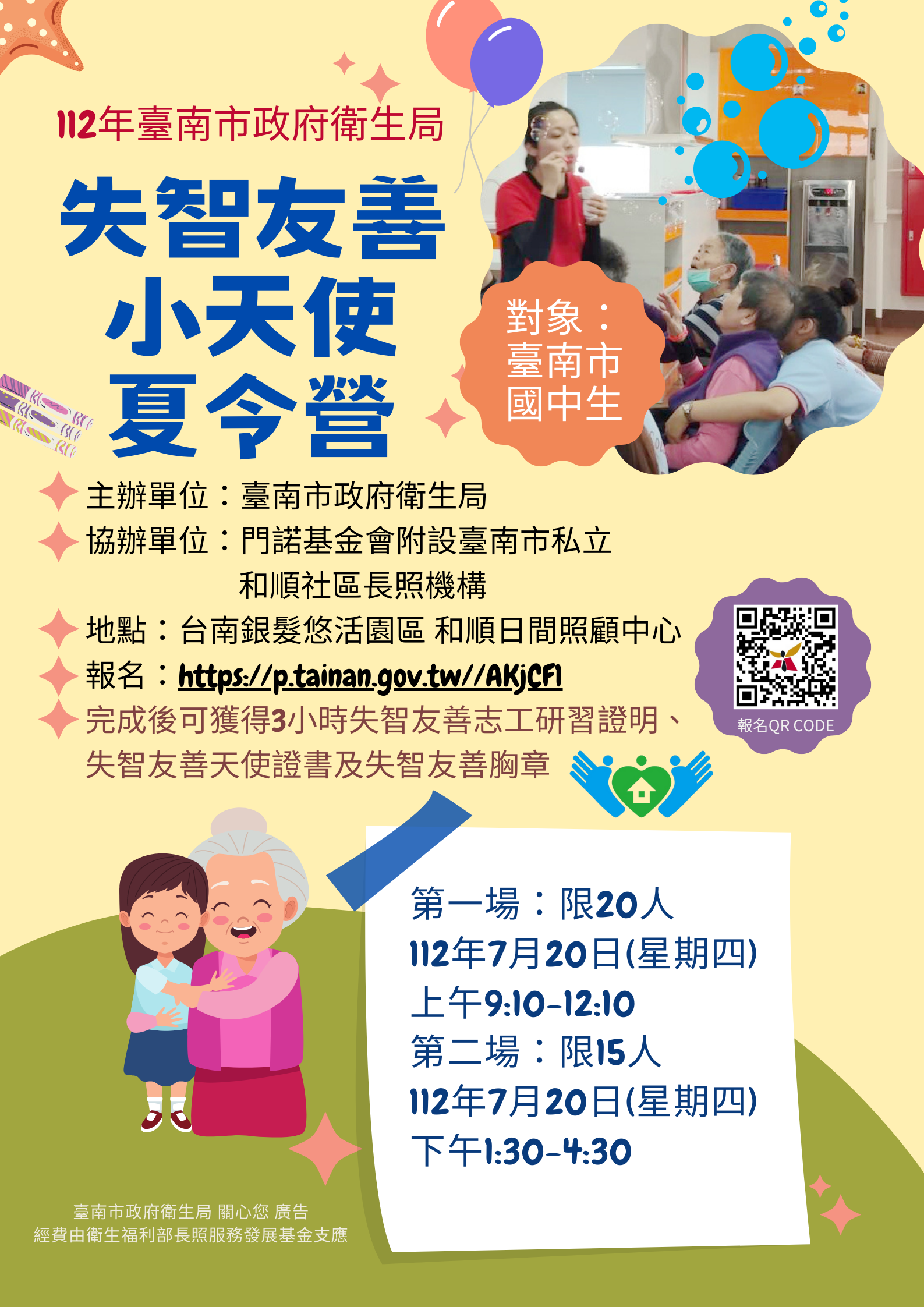 五、辦理方式:招募國中生參加活動,透過失智友善及代間學習互動等課程讓學生瞭解失智症,從小學習尊重、愛與關懷,並於活動結束後撰寫心得,完成後可獲得 3 小時失智友善志工研習證明、失智友善天使證書及失智友善胸章。