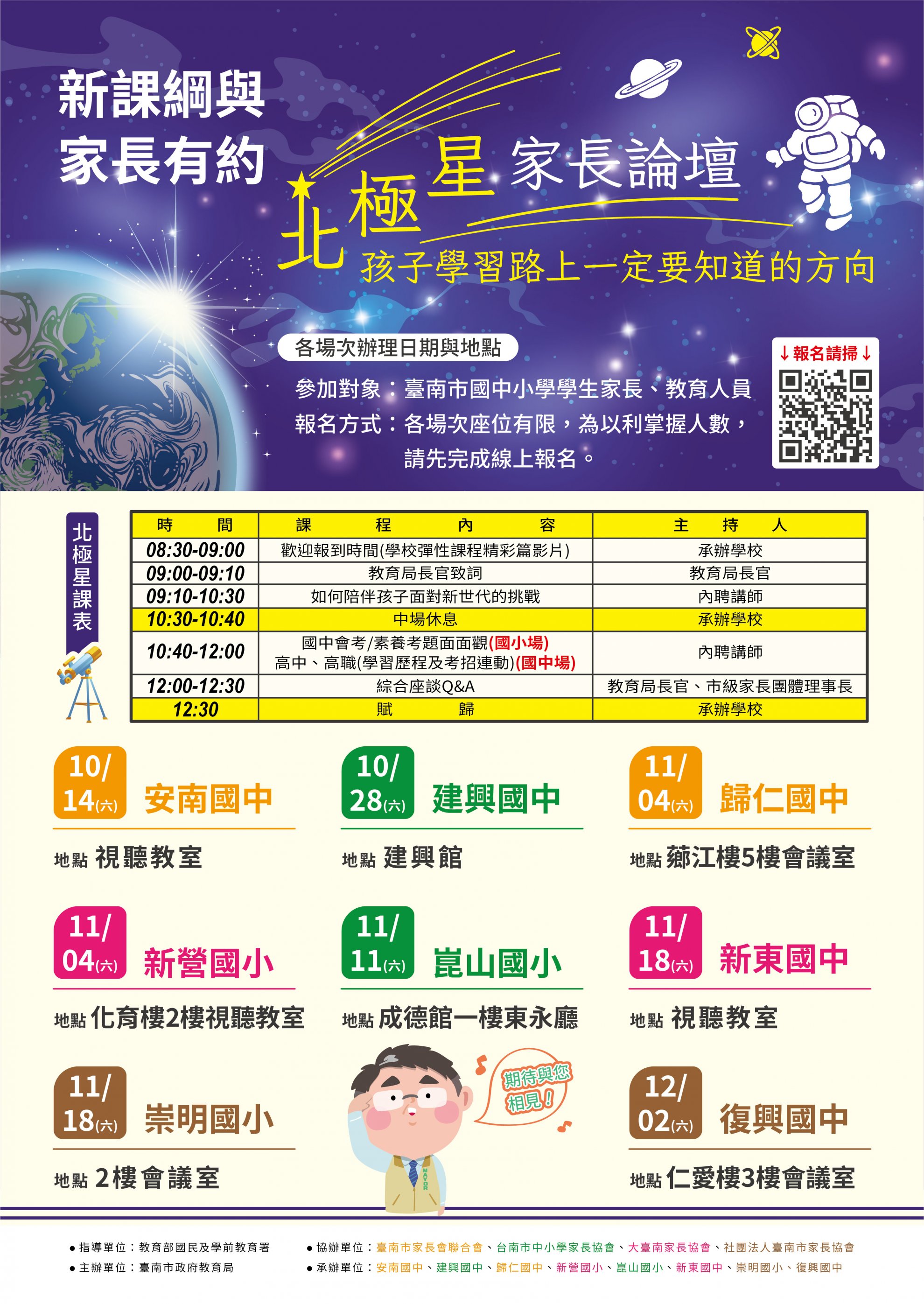 二、為協助本市家長了解國教總綱及最新教育趨勢,臺南市政府教育局與臺南市家長會聯合會、台南市中小學家長協會、大臺南家長協會、臺南市家長協會共同辦理八場次總綱宣講。