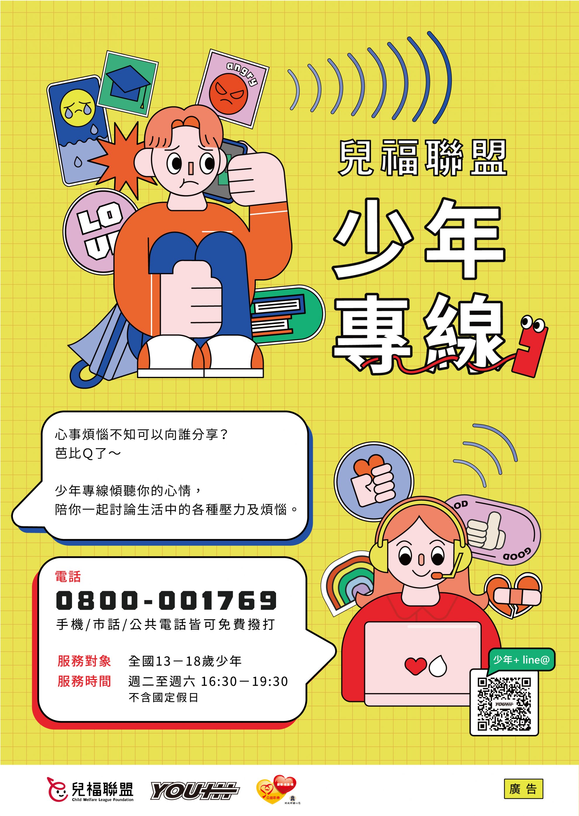 一、本會辦理「兒福聯盟-少年專線服務( 0800-001769 )」,提供全台 12 歲至 18 歲之少年免付費電話諮詢服務,服務時間為每週二至週六下午 4 : 30 至 7 : 30 。期待透過此專線傾聽少年的需求,協助其抒發壓力,並引導、陪伴他們面對和解決困難。