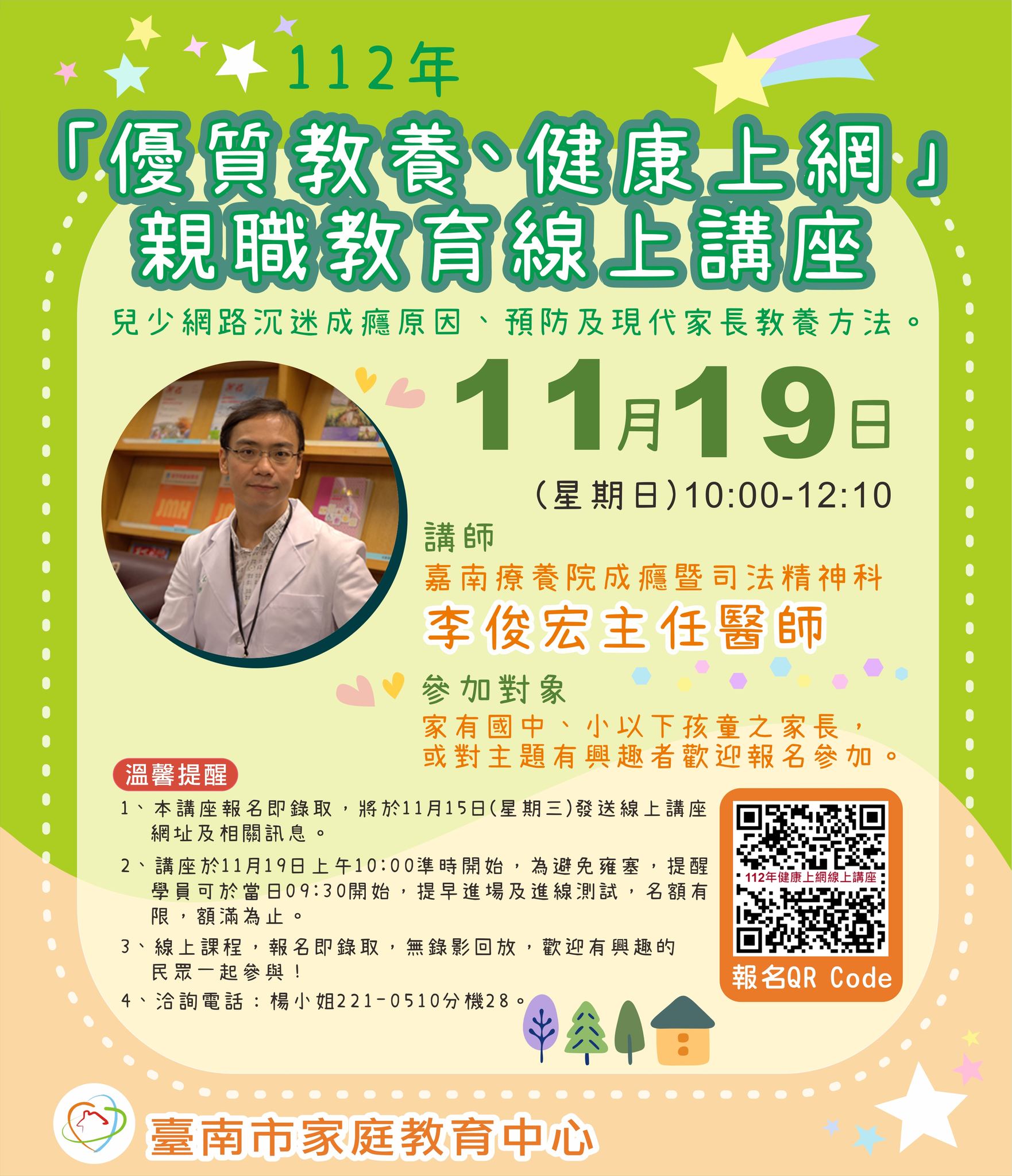 (七)本講座報名即錄取,將於 11 月 15 日(星期三)發送線上講座網址及相關訊息。