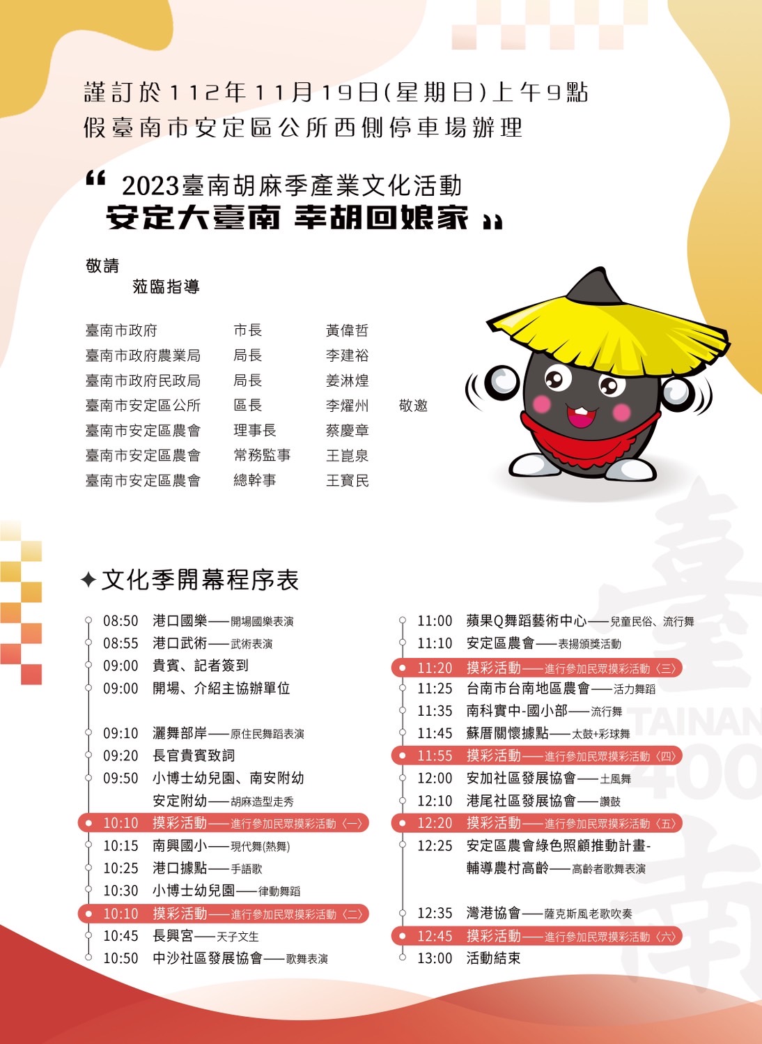 三、相關活動訊息請至安定區公所網站(https://web.tainan.gov.tw/anding/),亦可於臉書搜尋「安定區公所」查詢或洽詢本所農業及建設課王先生。