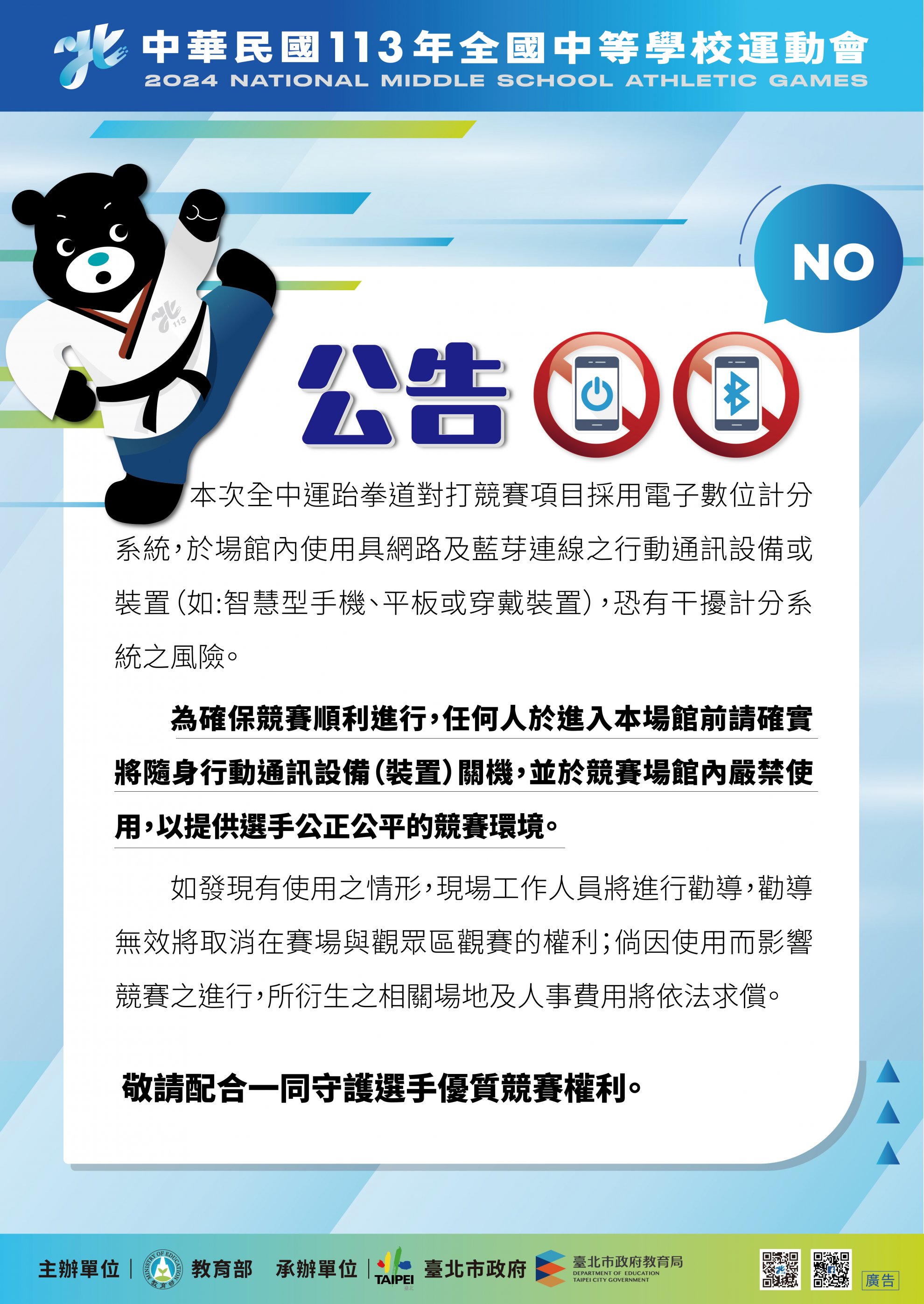 三、為提供選手公正公平的競賽環境,於競賽場內禁止使用網路與藍芽的電子通訊用品為旨揭賽事順利進行,任何人於進入場館前請確實關閉隨身行動通訊設備(裝置)。