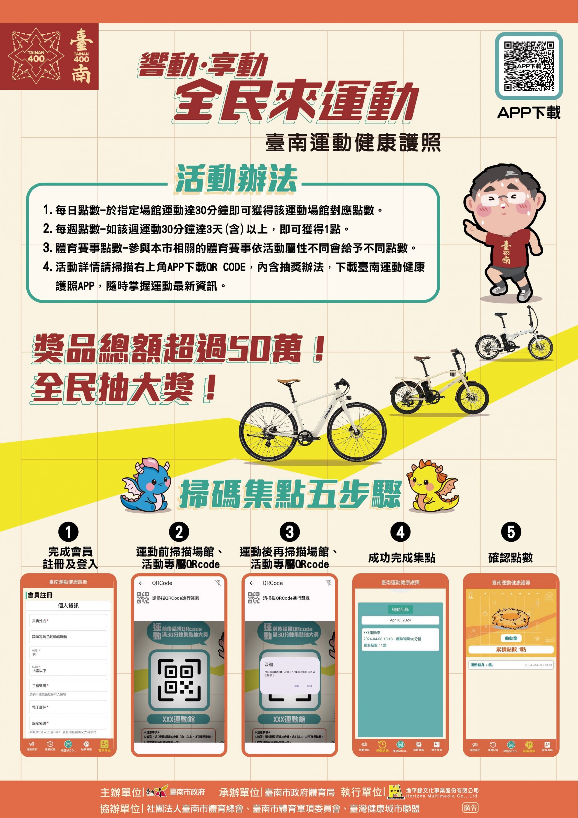 一、旨揭 APP 提供本市運動相關資訊,為鼓勵全民參與運動,爰規劃運動掃碼集點抽獎活動。民眾於本市指定配合場館中運動達 30 分鐘或參與臺南運動賽事,即可獲得對應點數,累積 20 點即可獲得抽獎資格一次。