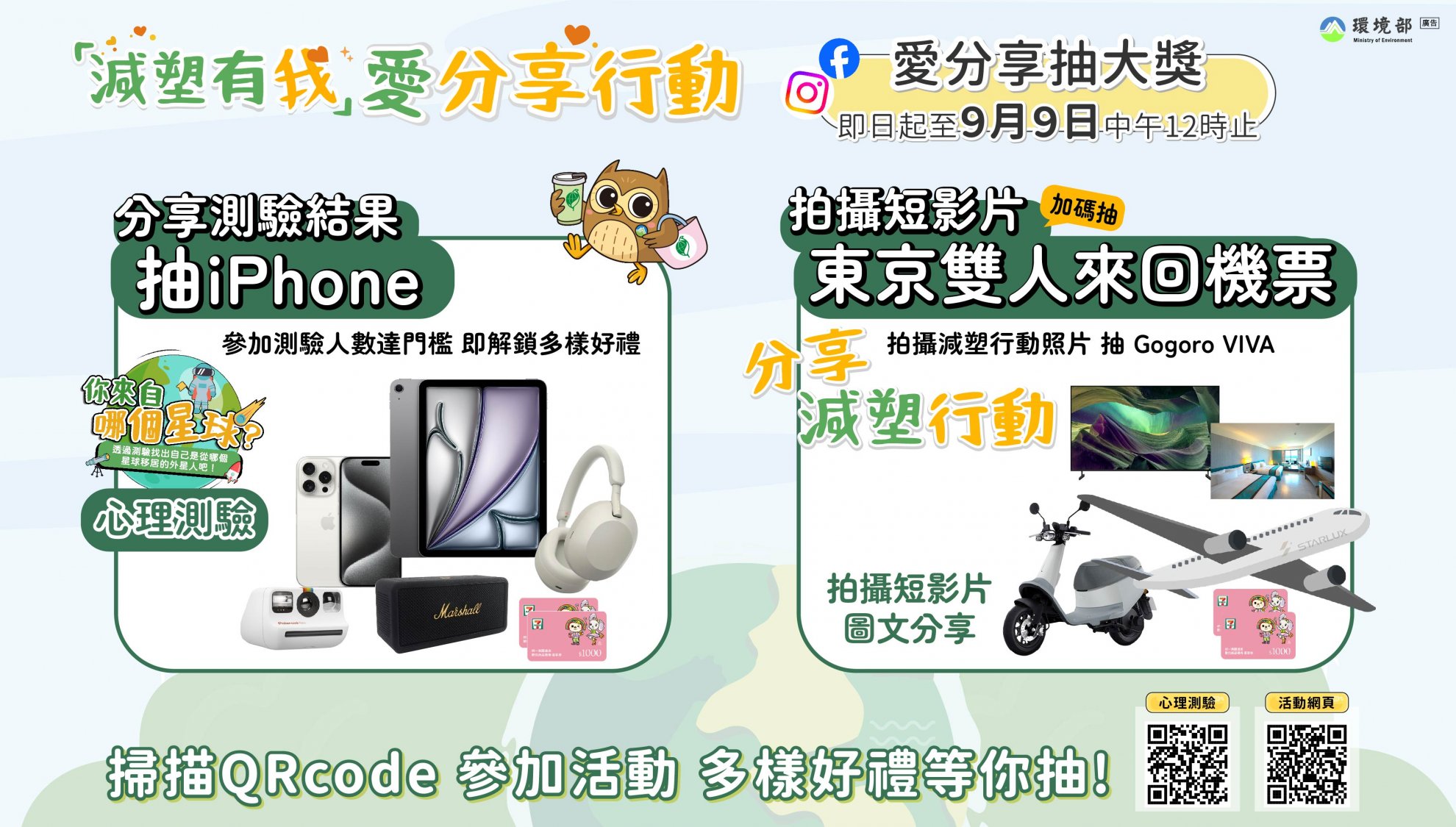 二、環境部為鼓勵社會大眾及莘莘學子在暑期假期間一起跟上全球減少塑膠的風潮,特辦理「減塑有我」愛分享行動,可透過臉書(Facebook)、 Instagram(IG)等社群媒體,拍攝個人生活中減塑短影片、減塑生活照片,並可透過參加 「你來自哪個星球?」心理測驗遊戲,瞭解並發覺屬於自己獨特的環保行動,歡迎民眾邀請親朋好友一起在生活中響應減塑行動,參加旨揭活動拿大獎。