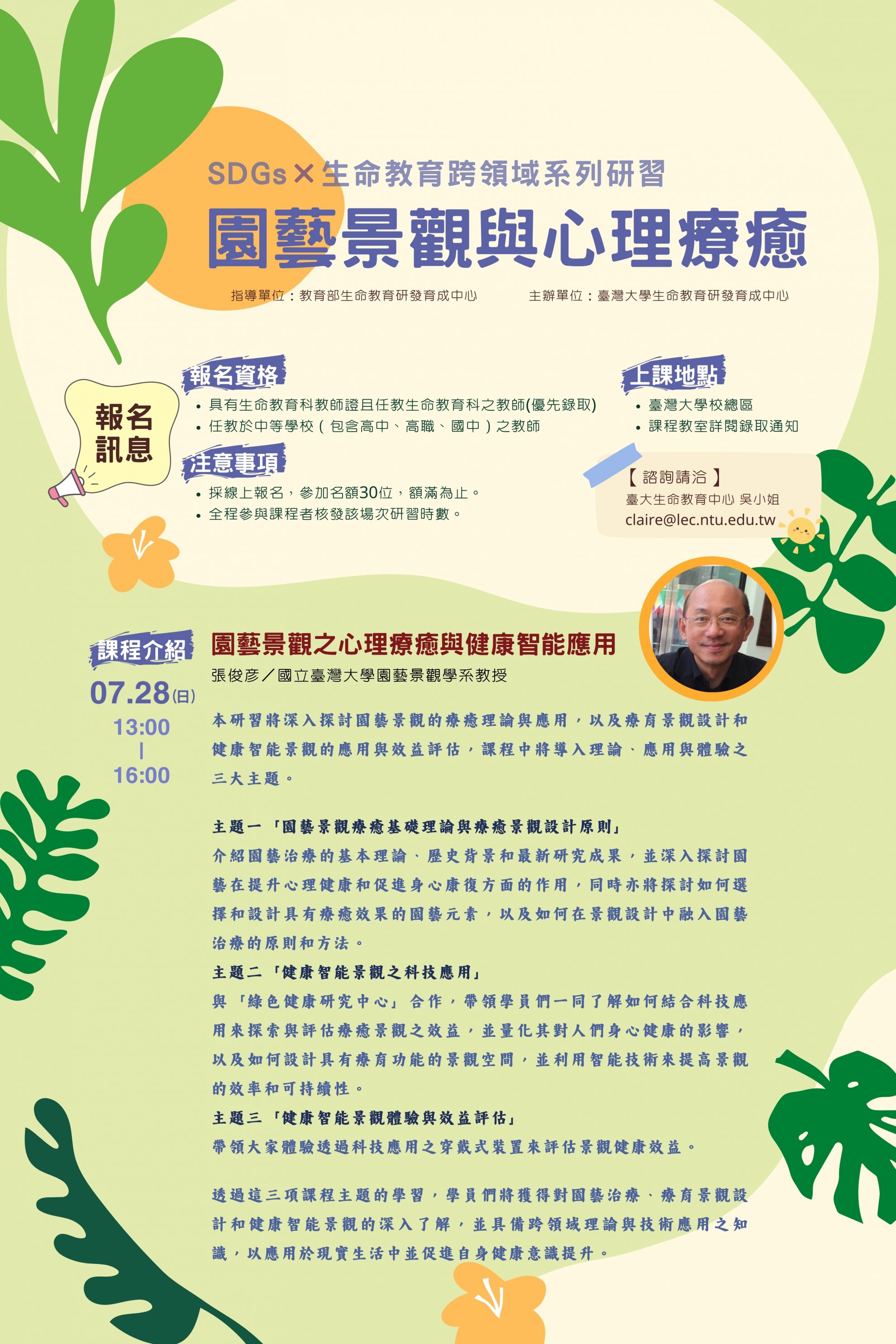 2、 7 月 28 日:園藝景觀之心理療癒與健康智能景觀應用。