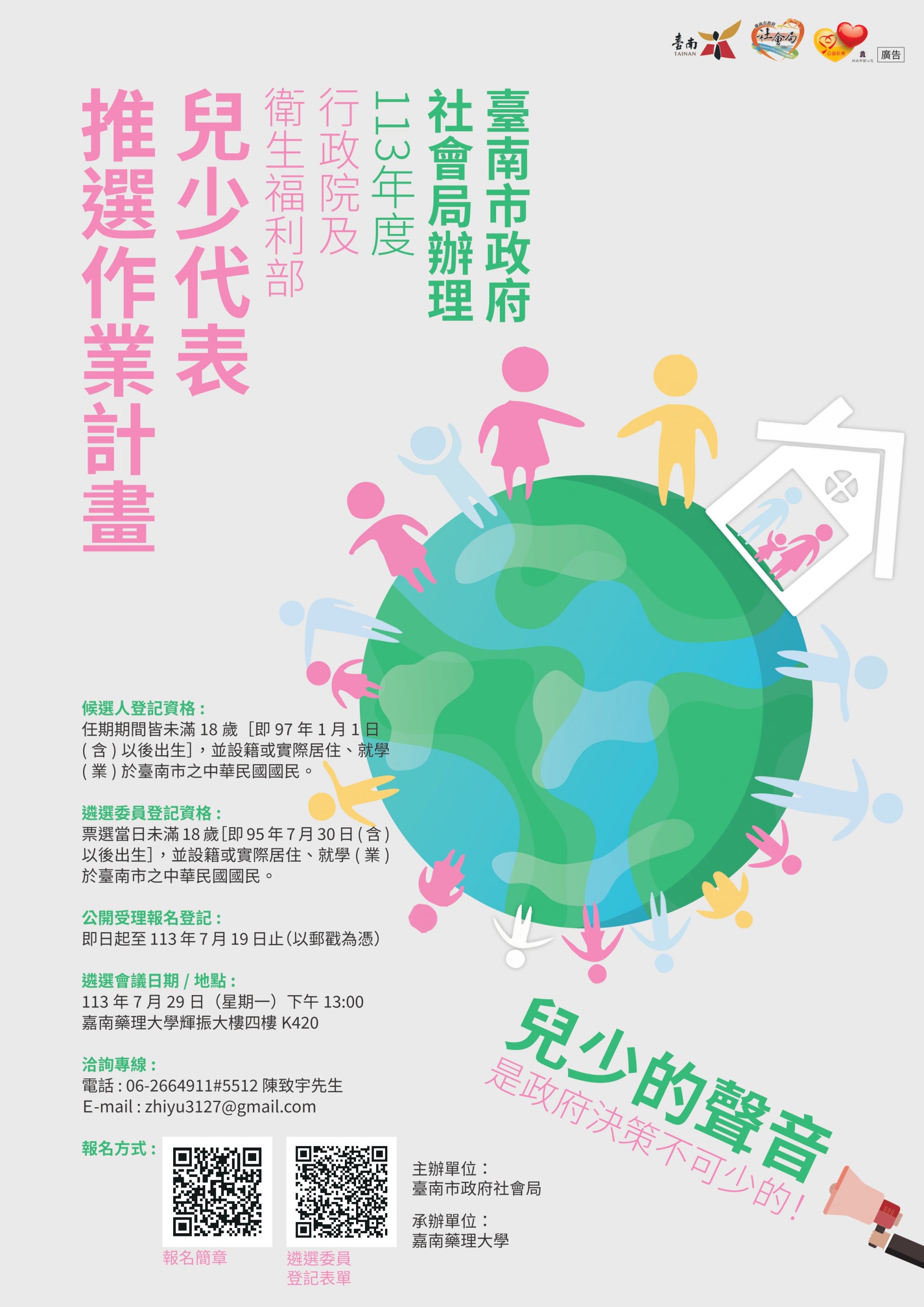 二、為配合中央推動兒童及少年福利政策,落實兒童權利公約第 12 條、兒童權利公約施行法第 6 條、兒童及少年福利與權益保障法第 10 條規定,保障兒童及少年(以下簡稱兒少)參與行政院及衛生福利部所設兒少福利與權益事務相關小組運作權益,本局委託嘉南藥理大學辦理行政院及衛生福利部兒少代表推選作業。