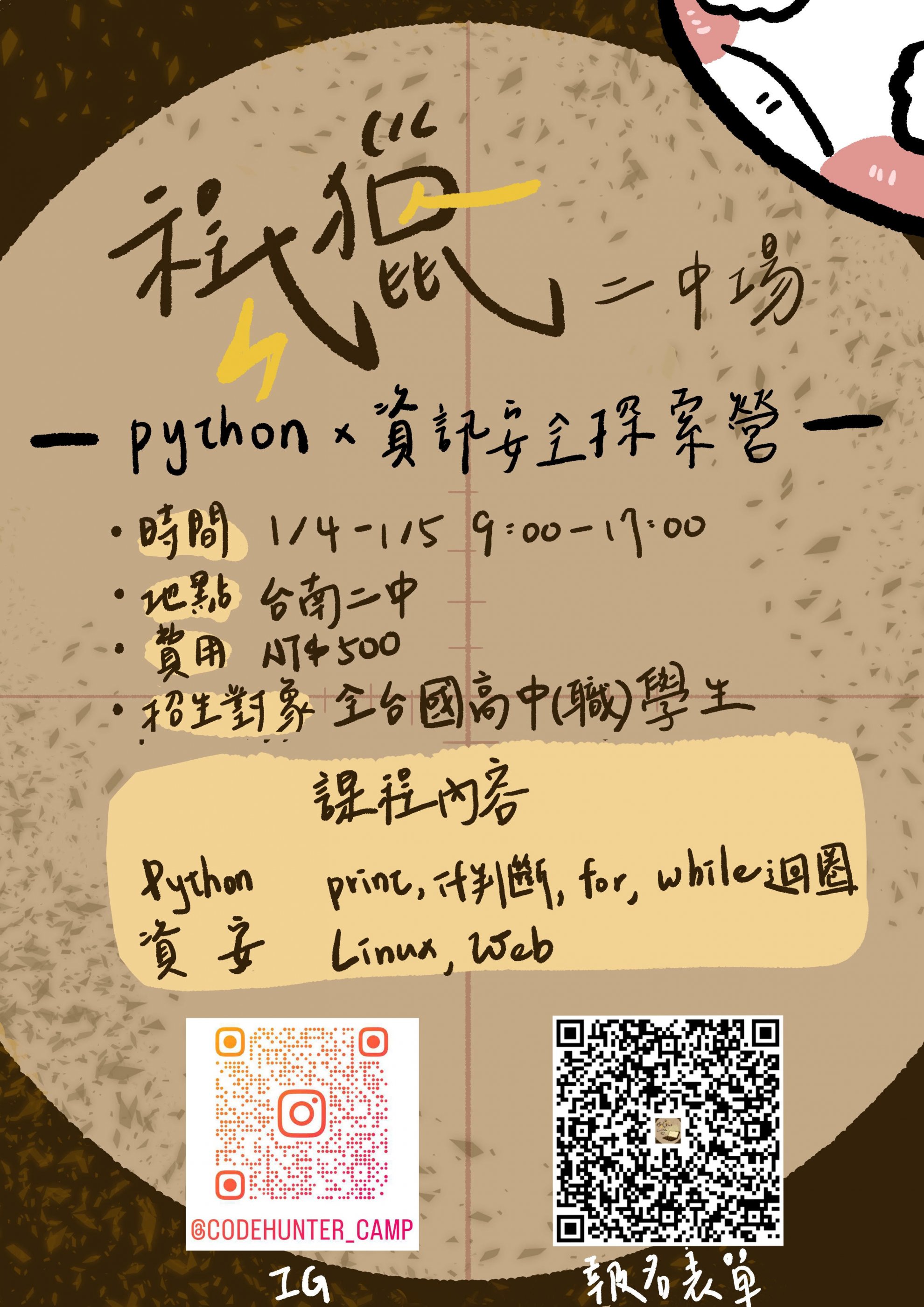 主旨:本校學生辦理「程式獵人」營隊,敬請協助公告。說明: