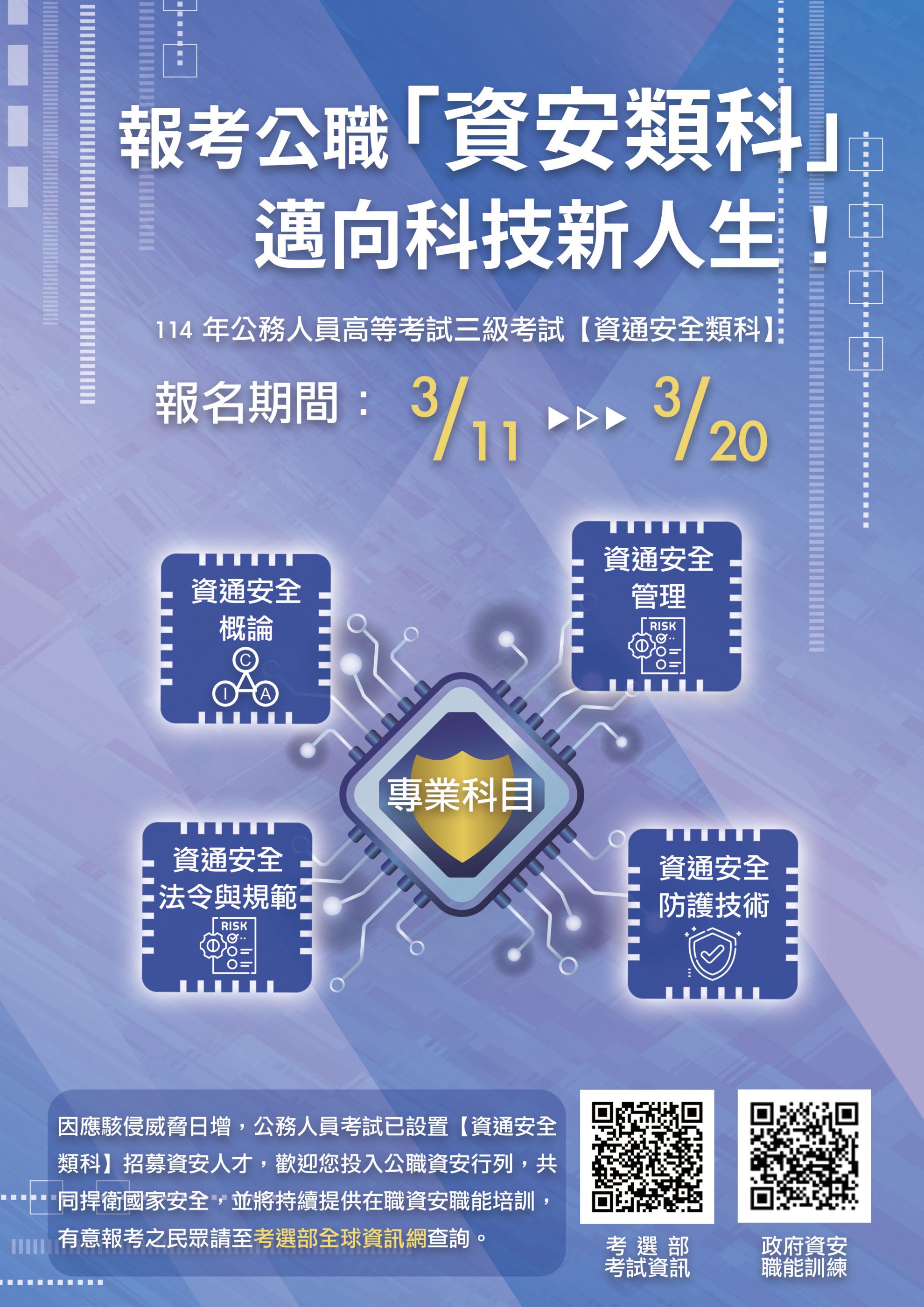 因應駭侵威脅日增,公務人員考試已設置【資通安全類科】招募資安人才,歡迎您投入公職資安行列,共同捍衛國家安全,並將持續提供資安職能生涯培訓, 114 年考試自 3 月 11 日至 3 月 20 日受理網路報名,有意報考之民眾請至考選部全球資訊網查詢。