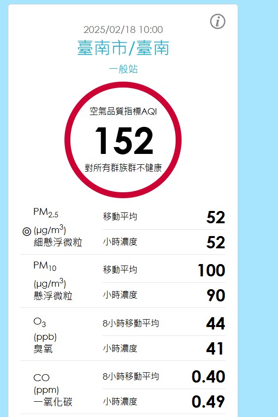 一、本日(2/18)上午 8 時臺南(154)、安南(154)、善化(154)及新營(153)測站 AQI 指標值已逾 151 達紅色警示,配合辦理事項為: