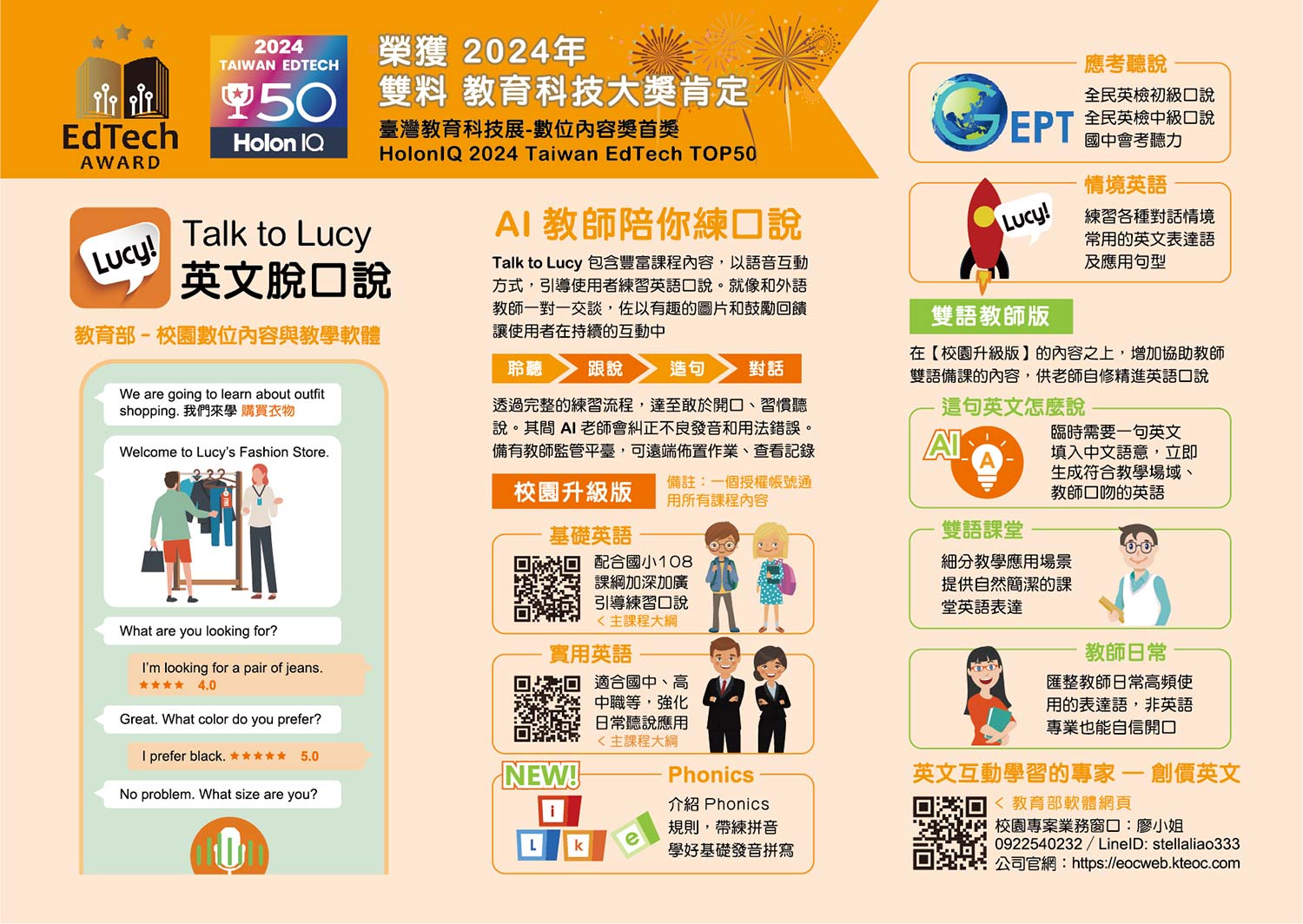 (二)產品「Talk to Lucy 英文脫口說」榮獲 2024 年臺灣教育科技展「數位內容獎」第一名及 Edtech Icon 大獎。