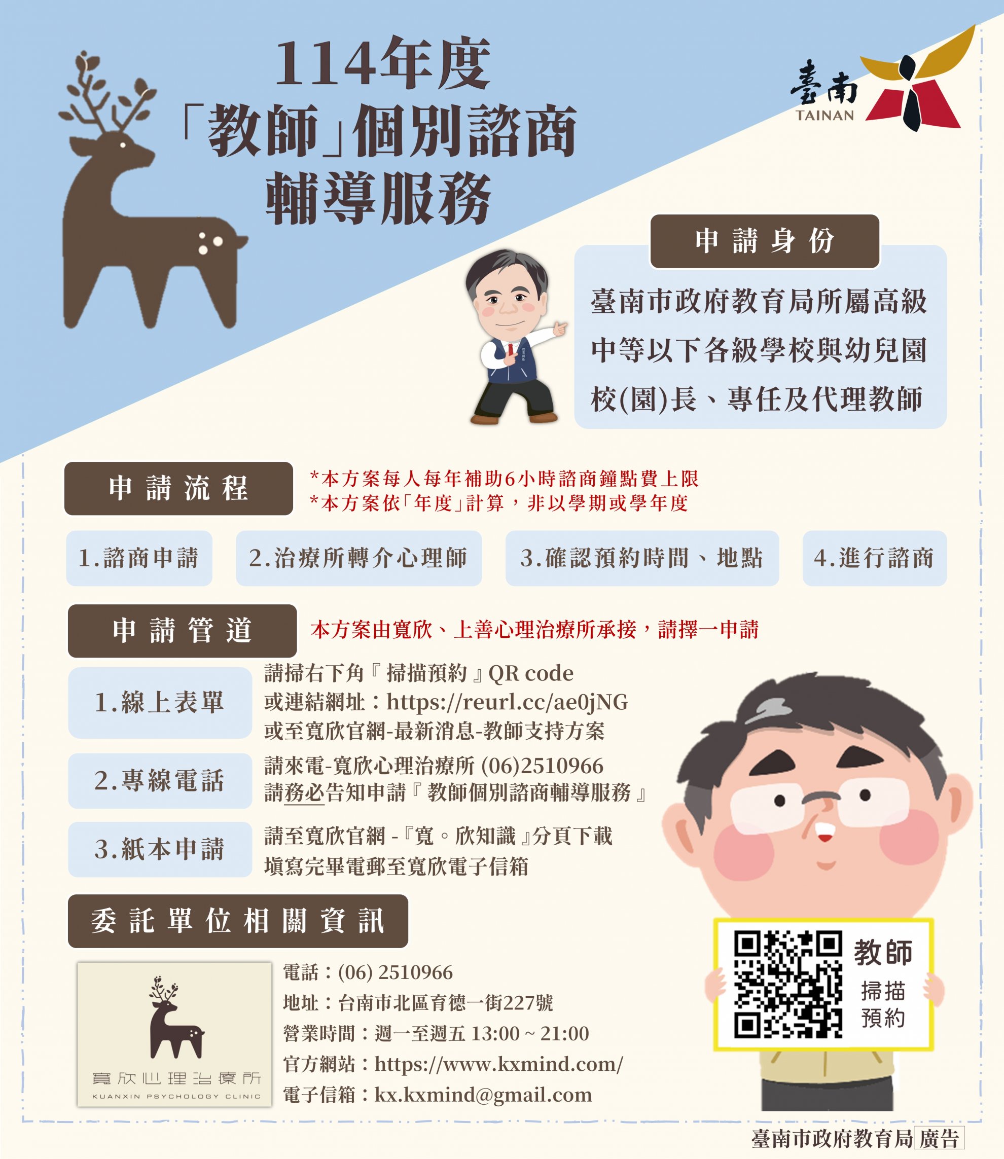 四、本府教育局業於 114 年 3 月 13 日與諮商輔導受託單位(寬欣心理治療所及上善心理治療所)簽約(後續如有其他受託單位將另行通知)。