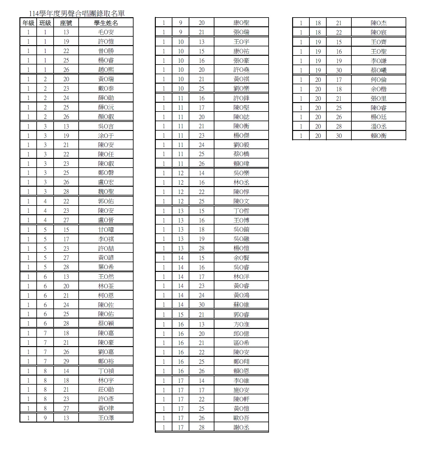 一、114學年國一新生男聲合唱團錄取名單如下表,請參閱。(家長同意書請繳交至學務處活動組或於暑訓時繳交給社團指導老師)