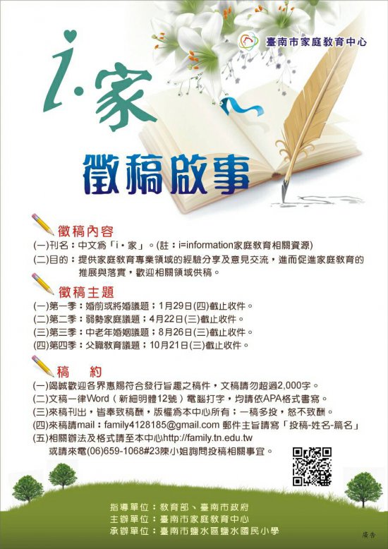 三、活動辦法徵文啟示(含投稿格式、基本資料表及切結書)將自即日起,載於臺南市家庭教育中心網站頁面(http://family.tn.edu.tw)備查詢。