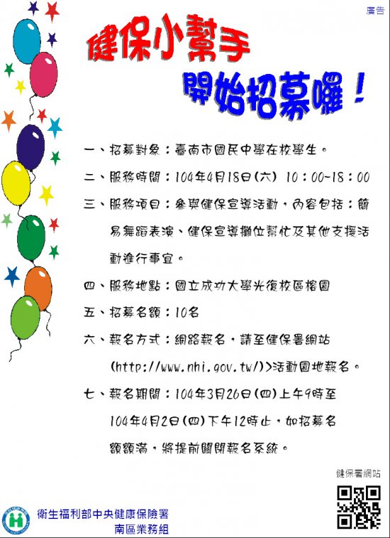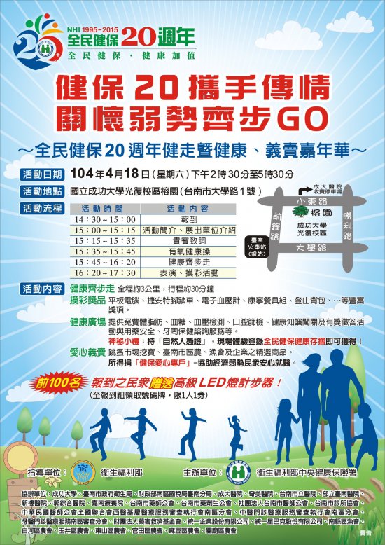 三、另其將於 104 年 4 月 18 日(星期六)假成功大學辦理「全民健保 20 週年健走暨健康、義賣嘉年華」,活動文宣如附件二。