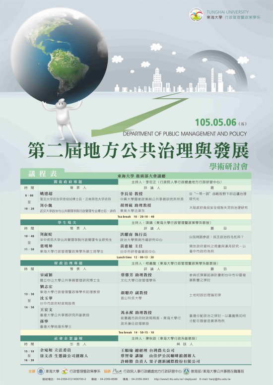 二、為強化公部門掌握地方公共治理與管理發展最新趨勢及議題,行政院人事行政總處地方行政研習中心(以下簡稱研習中心)與東海大學合作,於本年 5 月 6 日(星期五)在東海大學推廣部大會議廳(地址:臺中市西屯區台灣大道四段 1727 號),舉辦旨揭學術研討會。