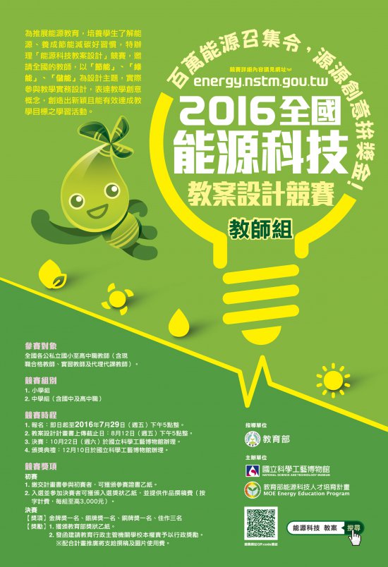 一、本案為教育部指導之全國性競賽,主要目地在於邀請全國中小學教師實際參與能源科技教學實務設計,期能設計具創意性並能有效達成教學目標之課程活動,將能源科技真正落實於日常教學中,確實引導學生展開珍惜能源、愛護環境的行動。