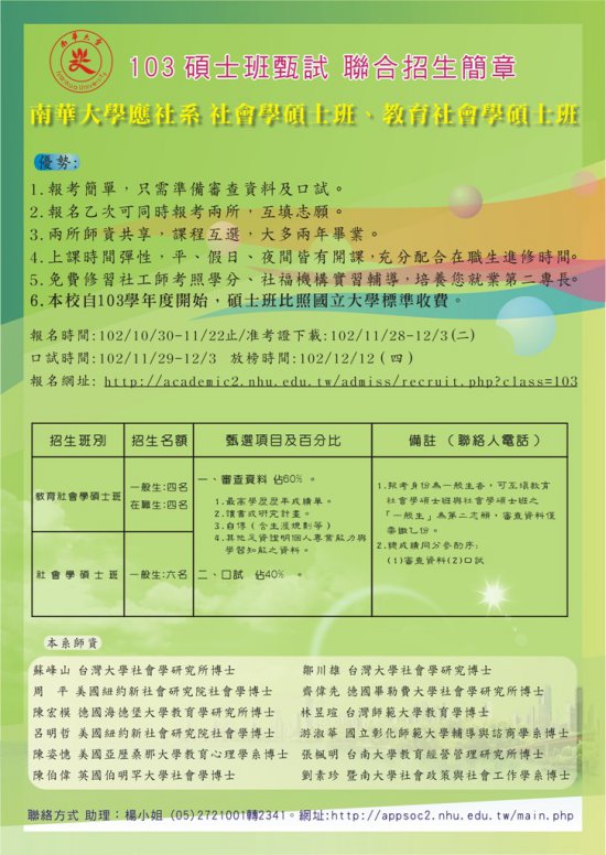 一、報名乙次可同時選填兩所志願,僅需準備審查資料(佔 60%)及口試(佔 40%),報名至 102 年 11 月 22 日止。 二、旨揭二研究所師資共享、課程互選,上課時間彈性,平假日、夜間皆有開課,充分配合在職生進修時間。 三、南華大學自 103 學年度開始碩士班比照國立大學標準收費,詳細招生資訊請參考網址:http://www.nhu.edu.tw/~exam。 四、檢送碩士班甄試海報乙份。