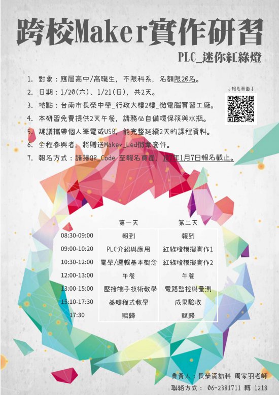 三、參加對象:臺南一區合作學校(臺南高商、臺南女中、臺南一中、長榮女中、長榮中學、六信高中、德光高中、光華高中、臺南海事、南英商工、亞洲餐旅、慈幼工商、華德工家、南寧高中)及社區國中學生(不限科別)。