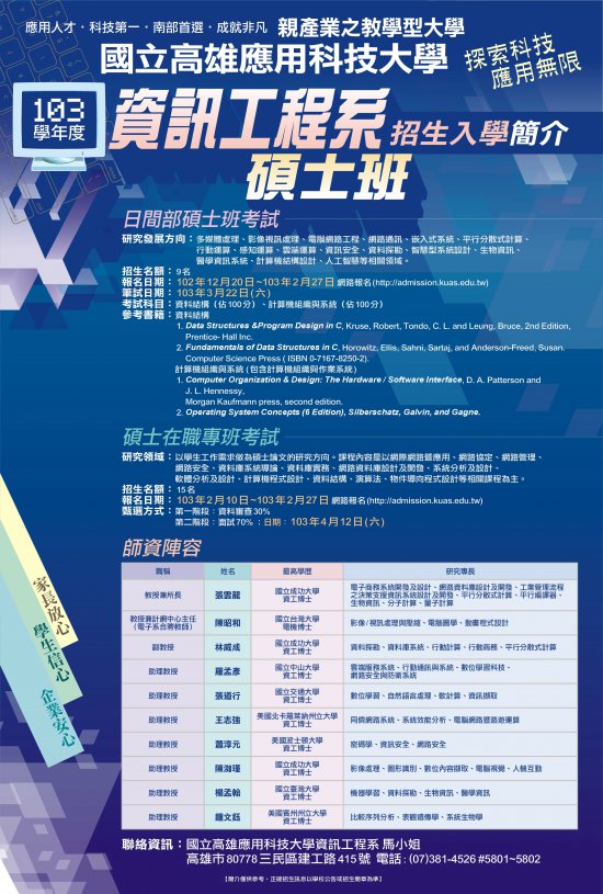 一、該校 103 學年度資訊工程系碩士在職專班招生資訊如下: (一)招生名額: 15 名 (二)網路報名日期: 103 年 2 月 10 日至 103 年 2 月 27 日。 (三)面試日期: 103 年 4 月 12 日。 (四)甄試項目:書面審查、面試,免筆試。 二、招生資訊網站:http://admission.kuas.edu.tw ,歡迎對資訊科技領域有興趣之各界先進踴躍報名