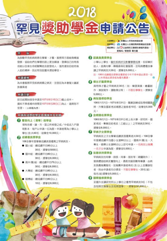 二、為協助有心向學之罕見疾病病患,該會特辦理「2018 罕見疾病獎助學金」,申請項目分為「奮發向上(清寒)助學金」、「成績優良獎學金」、「認真負責獎學金」、「傑出才藝獎學金」、「病友進修助學金」、「金榜題名獎學金」、「罕病子女獎學金」、「友善扶持獎學金」及「國際進修獎學金」等 9 個項目。