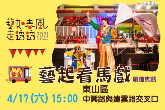 說明: 一、依據臺南市政府文化局 110 年 1 月 18 日南市文永字第 1100170938 號函辦理。 二、活動訊息 (一)演出單位:創造焦點 (二)演出節目:藝起看馬戲 (三)演出時間: 110 年 4 月 17 日(星期六)下午 3 點 (四)演出地點:東山區東中里中興路與達雲路交叉口封路演出;雨備場地:東山國小大禮堂(733 台南市東山區青葉路二段 49 號)。 三、檢附活動文宣一份。