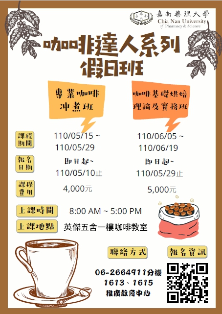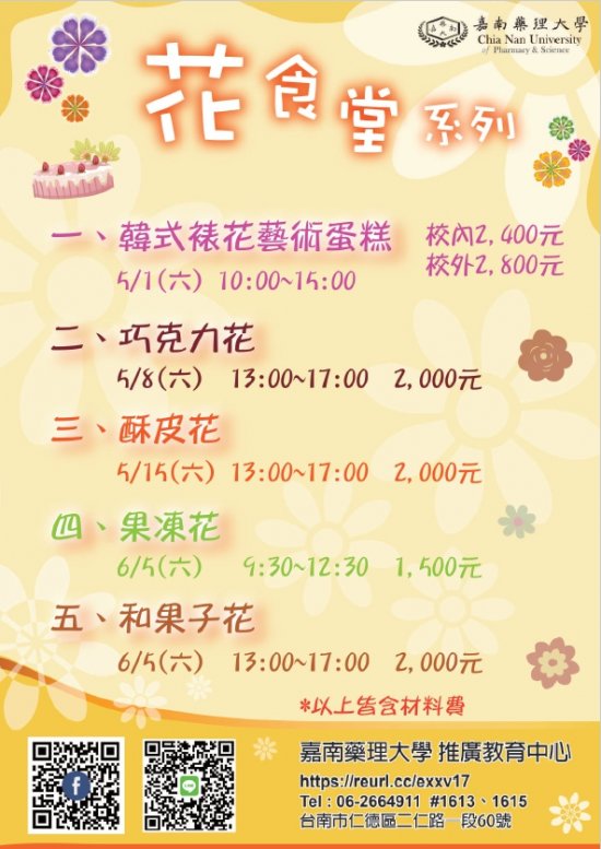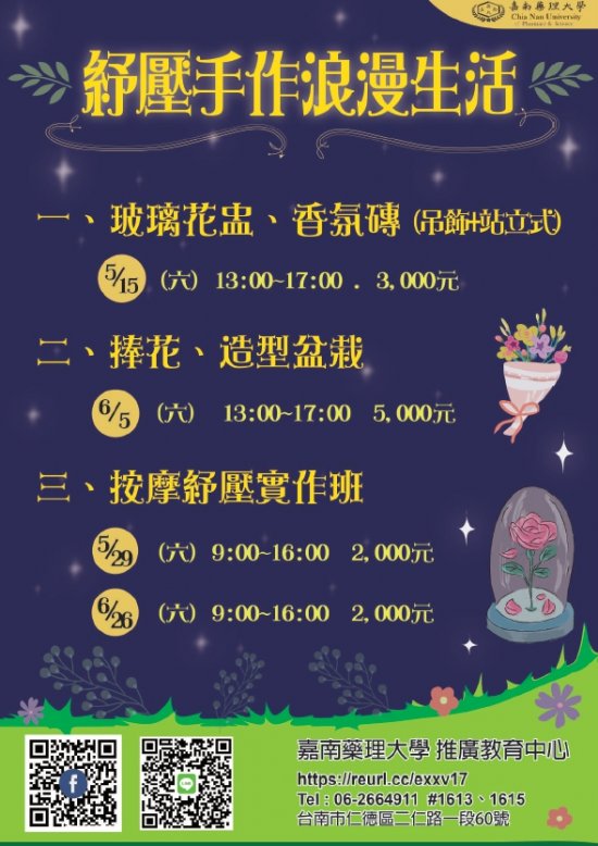 嘉藥學校財團法人嘉南藥理大學推廣教育中心辦理「紓壓手做浪漫生活系列」、「花食堂系列」及「咖啡達人系列」招生海報,鼓勵師生踴躍報名。