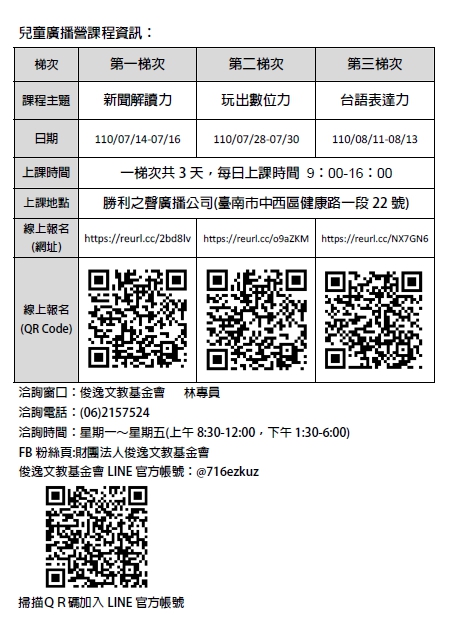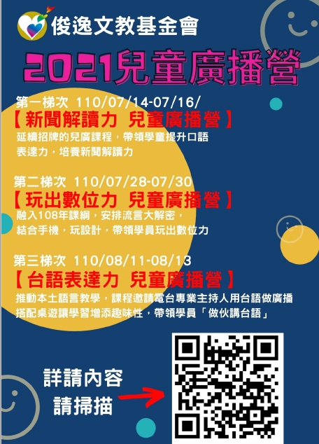 說明: 一、為豐富國小學童暑期多元學習面貌,本會結合勝利之聲廣播公司、電聲廣播電台、俊逸慈善基金會辦理「2021 兒童廣播營」。 二、相關課程內容、研習費用以及線上報名資訊,請至俊逸文教基金會網站→「活動報名」專區(網址: http://www.e-go.org.tw/e-go/event_list.asp)查詢。