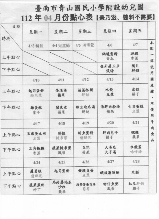 臺南市東山區青山國小附幼111學年第2學期4月餐點表
