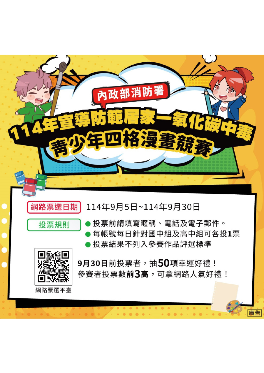 轉知:內政部消防署辦理「114 年宣導防範居家一氧化碳中毒青少年四格漫畫競賽」網路票選活動