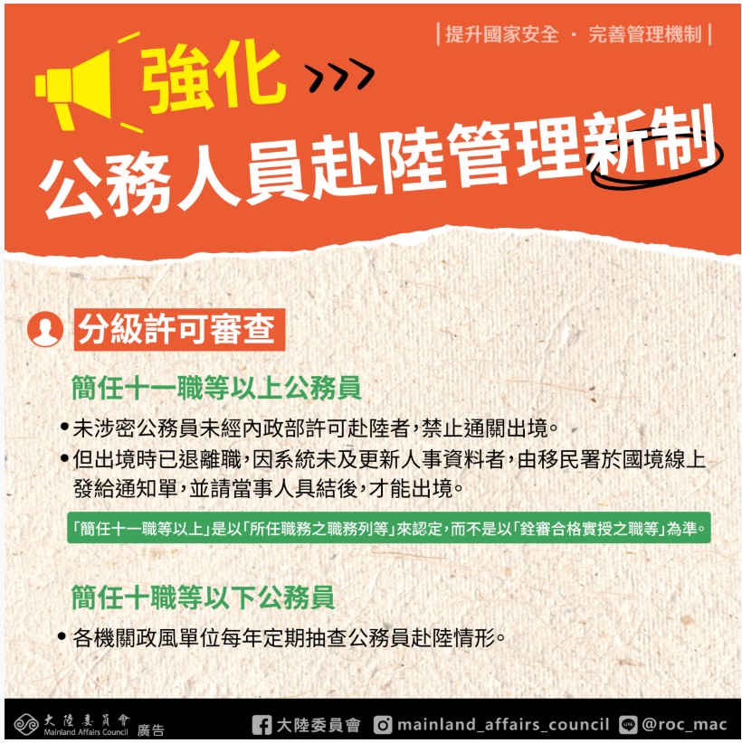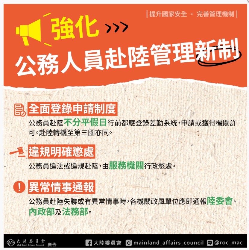 (一)所屬人員(無論人員類別及有無兼行政職務)(註:所有人),不論平、假日赴陸(入境中國大陸、從中國大陸機場入境轉機及不入境轉機-過境轉機) 、港澳,均應於赴陸、港澳前逕至陸委會「國人赴陸港澳動態登錄系統」登錄必要資訊,以保障赴陸後之人身安全。另赴陸前應申請許可或報經服務機關同意,並將登錄影本上傳至差勤系統(出國申請單),以利備查。