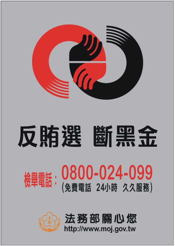 - 為倡導和諧、守法的選舉風氣,切實防制賄選介入選舉,使社會賢能之士能經由公正、公平、公開的選舉,達成服務社會之目的,法務部特以「i幸福-檢舉賄選,人人有責」為主軸印製宣導海報,期塑造良善之選舉風氣。http://bulletin.tn.edu.tw/ViewDetail.aspx?Bid=-1&bbid=76393