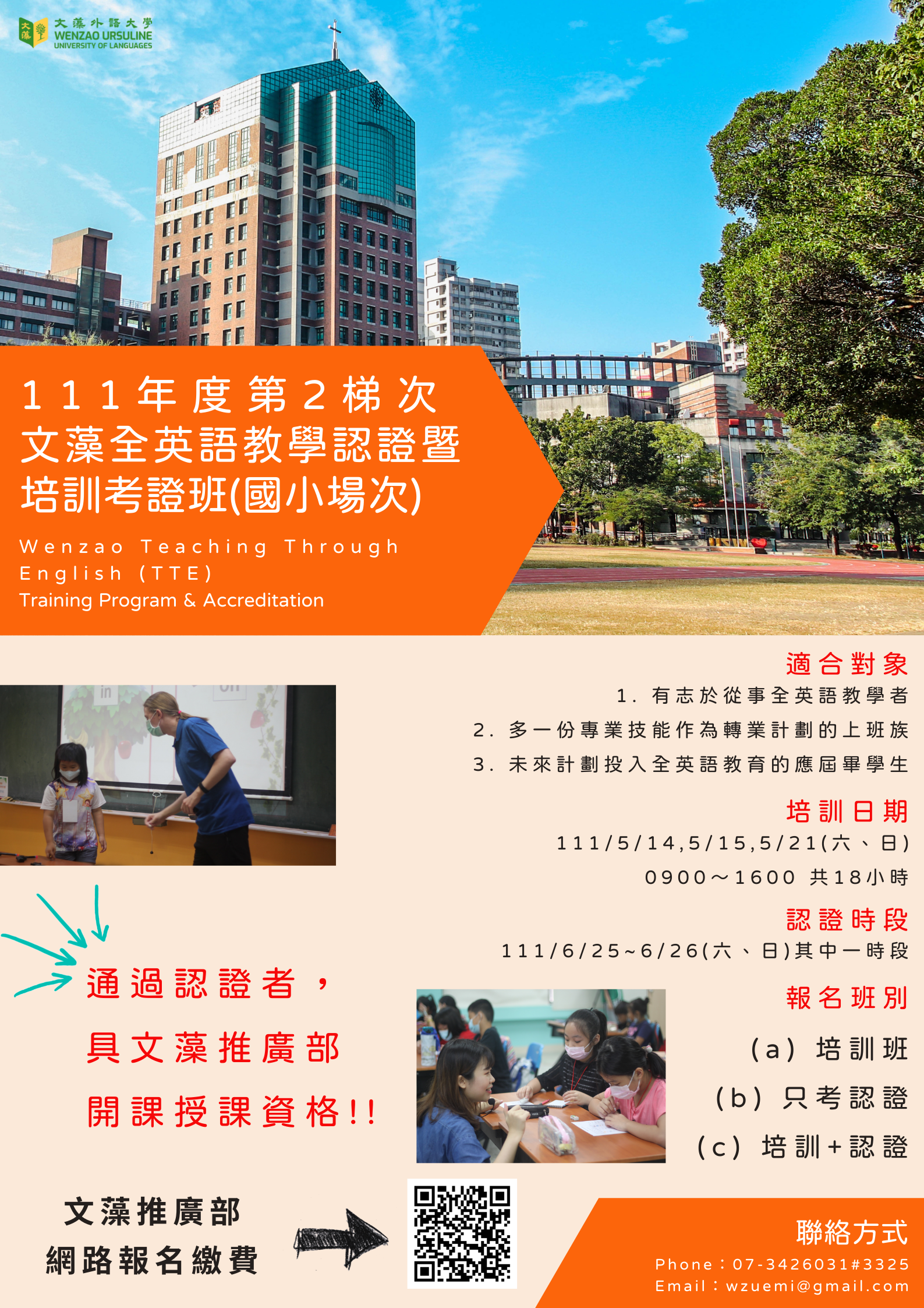 一、本校持續配合政府推動 2030 雙語教育,協助各級學校教師強化全英語教學能力,本校設計全台首創之全英語師資認證暨培訓課程,協助參與課程教師習得英(雙)語授課能力。