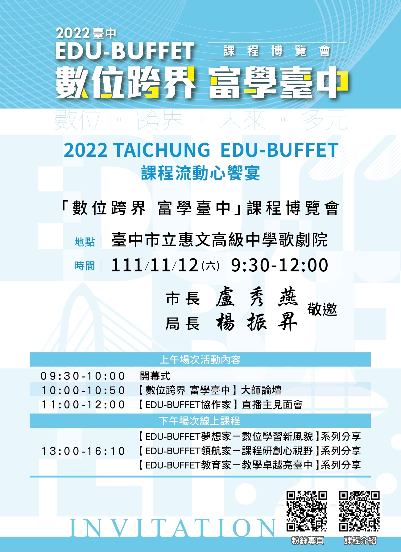 二、 2022 臺中 EDU-BUFFET 課程博覽會以「數位跨界 富學臺中」 為主題,期待與各縣市學校、教師及家長們,共同交流課 程研創與數位實踐之經驗,歡迎教育夥伴共襄盛舉,共同 因應疫情與數位之挑戰,體驗臺中多元豐富教育力。