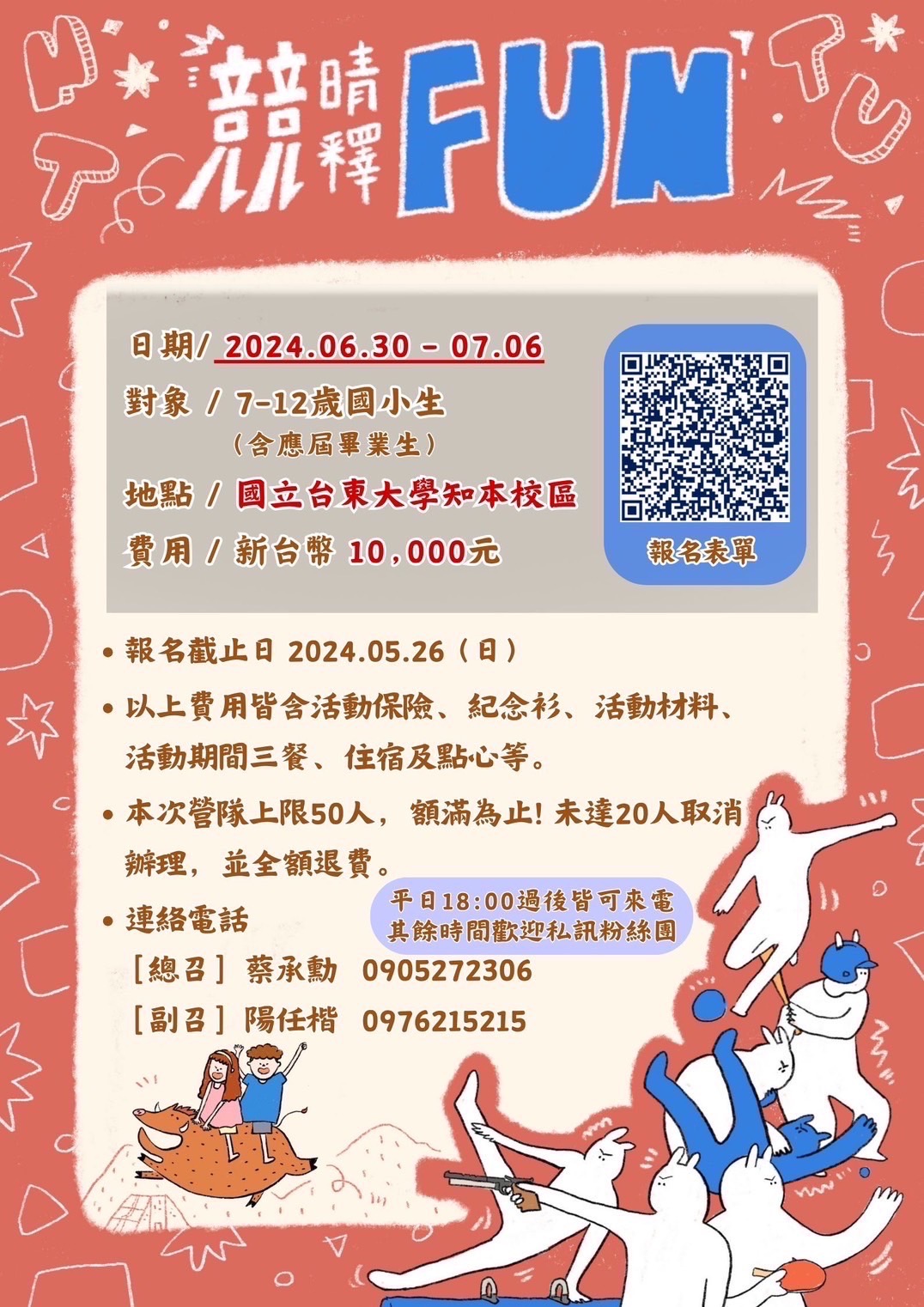 三、旨揭暑假營隊活動內容如附件,詳細資訊可至活動報名網頁查詢(網址: https://www.facebook.com/nttubpap.109/)。