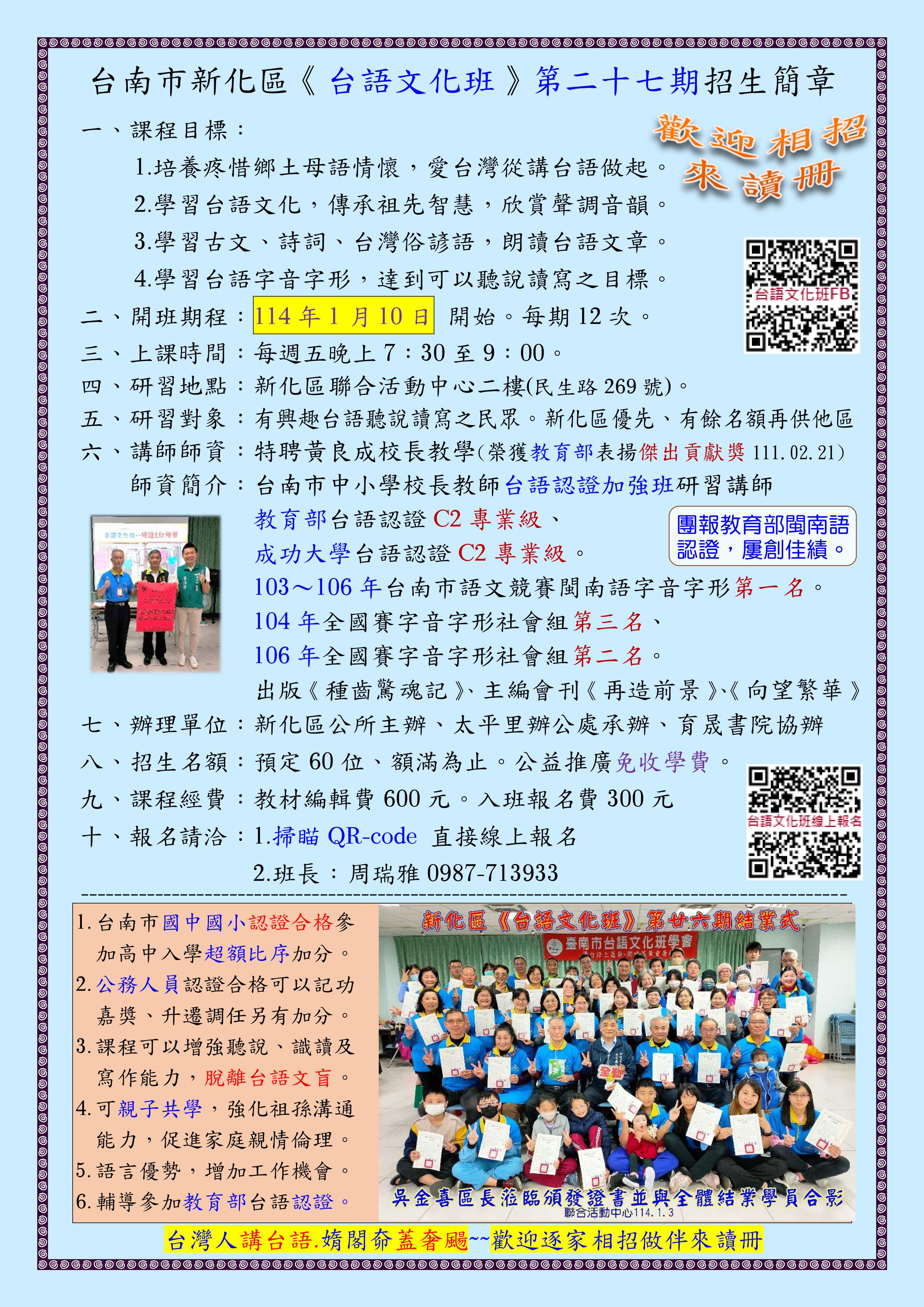 114年1月10日於新化聯合活動中心辦理第二十七期台語文化班課程
