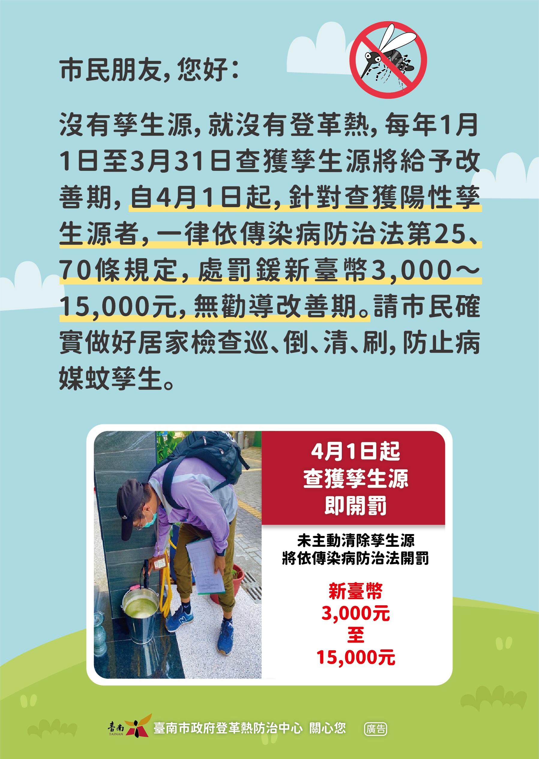 三、臺南市每年 1-3 月為登革熱防治衛教宣導期,查獲孳生病媒蚊孑孓,將先勸導清除及防治,並限期改善; 4 月 1 日起,民眾如未主動清除積水容器,導致孳生病媒蚊孑孓時,將依傳染病防治法處 3 千元到 1 萬 5 千元罰鍰;提醒您,落實「巡、倒、清、刷」,才能杜絕病媒蚊孳生,公私協力共同對抗登革熱,守護臺南健康家園!