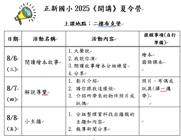 公布報名 113 學年度暑假營隊學生的名單與上課通知單(如附件) 請學員依照說明,參與活動喔! 以下四個營隊 1. 暑期英語育樂營 CAMP1 2. 暑期英語育樂營 CAMP2 3. 2025 開講口語訓練營 4. 魔法寫作營(中年級、高年級) 有問題請電詢教務處 5973113(分機 122) 謝謝~