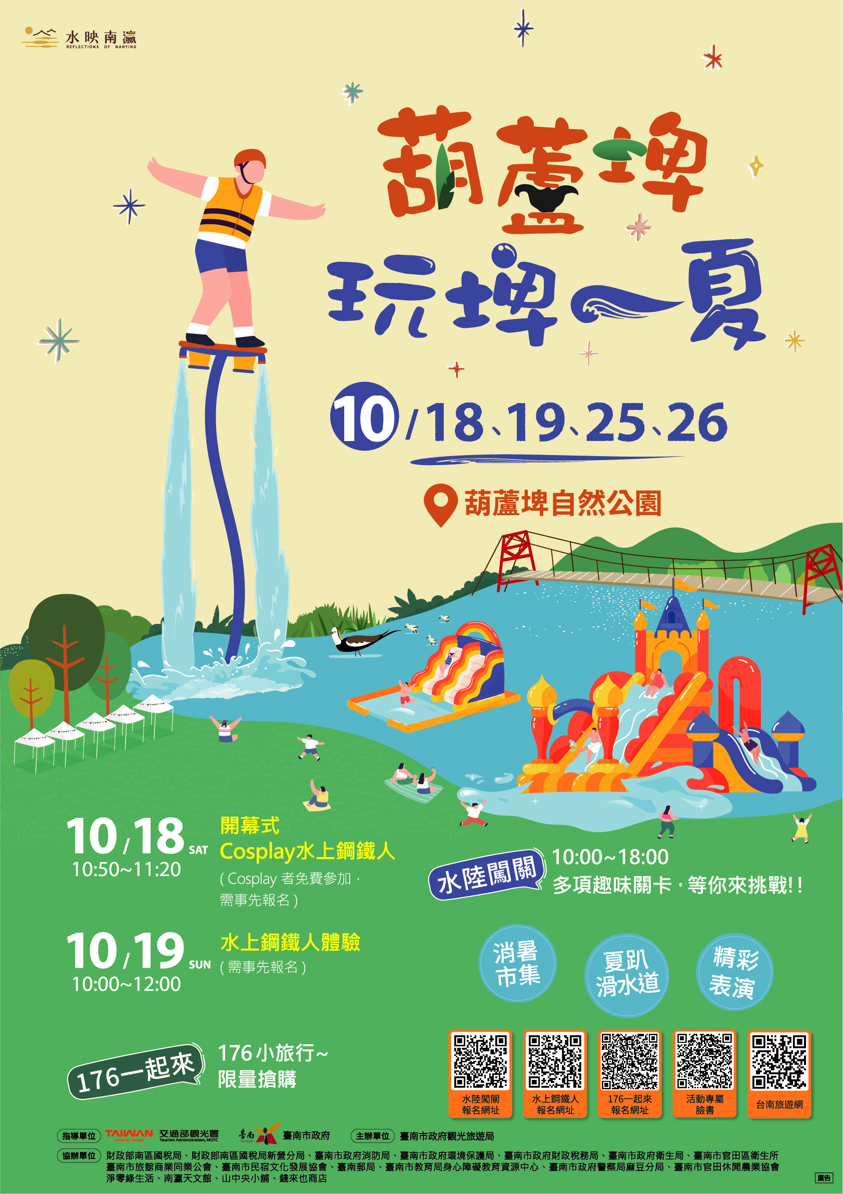 (四)活動內容:本次活動結合水陸闖關體驗、氣墊滑水道、精彩表演、消暑市集等豐富內容,並於 10 月 18 日-19 日限定舉辦「水上鋼鐵人飛行體驗」,歡迎踴躍參加,完成闖關除了可以領關卡集點獎勵外,還有機會抽獎拿好禮喔。