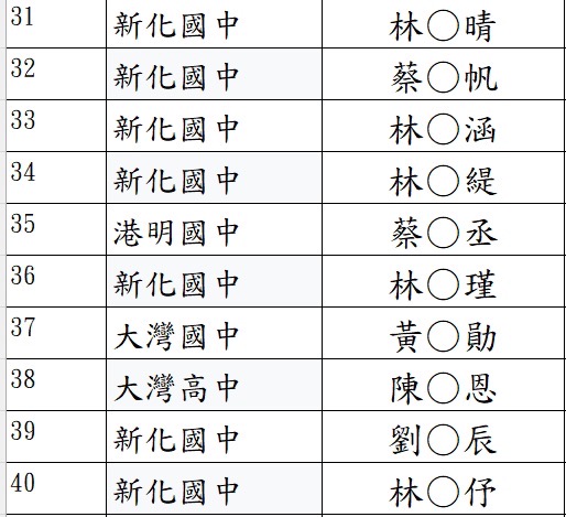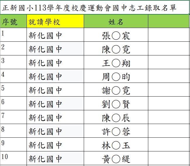 感謝大家熱烈參與本次運動會志工招募!由於報名人數踴躍,已超出原訂名額,學校已提前關閉報名表單。依報名順序,以下為本次錄取名單(40 人),備取 3 人。
